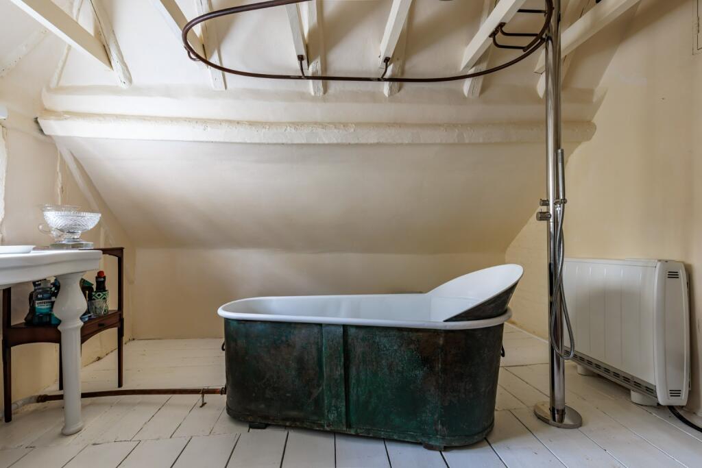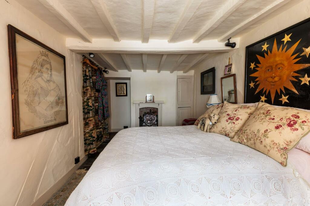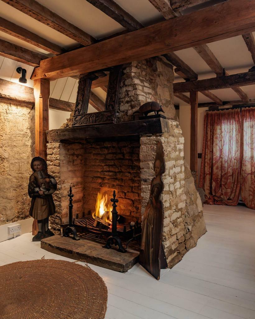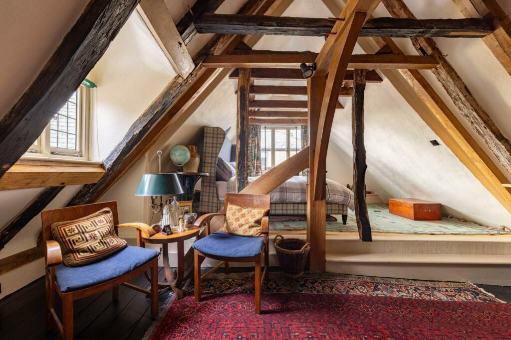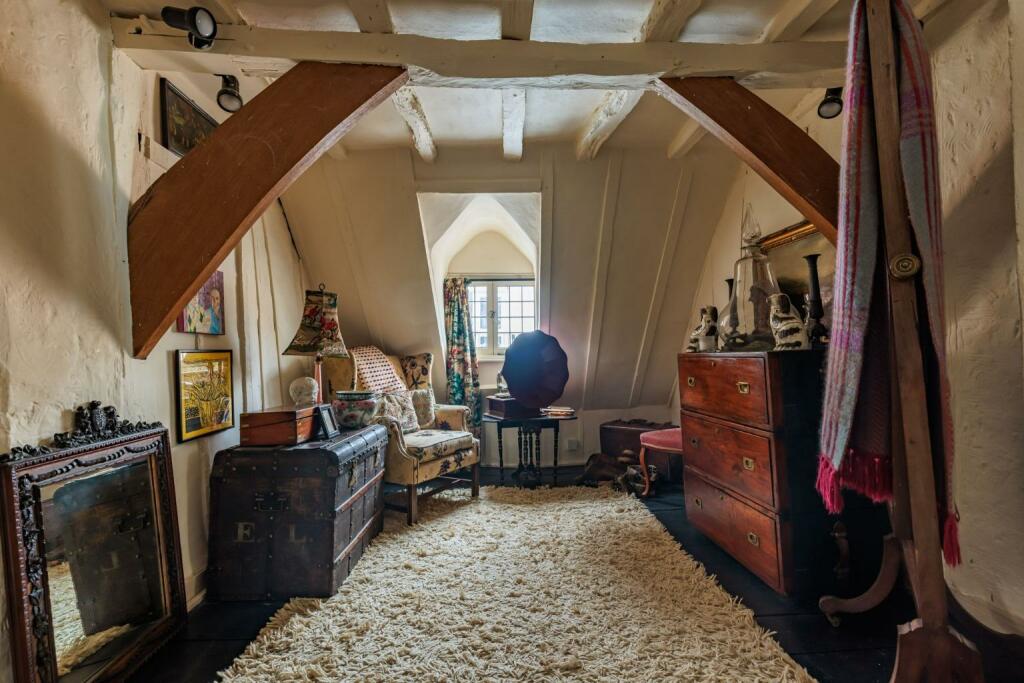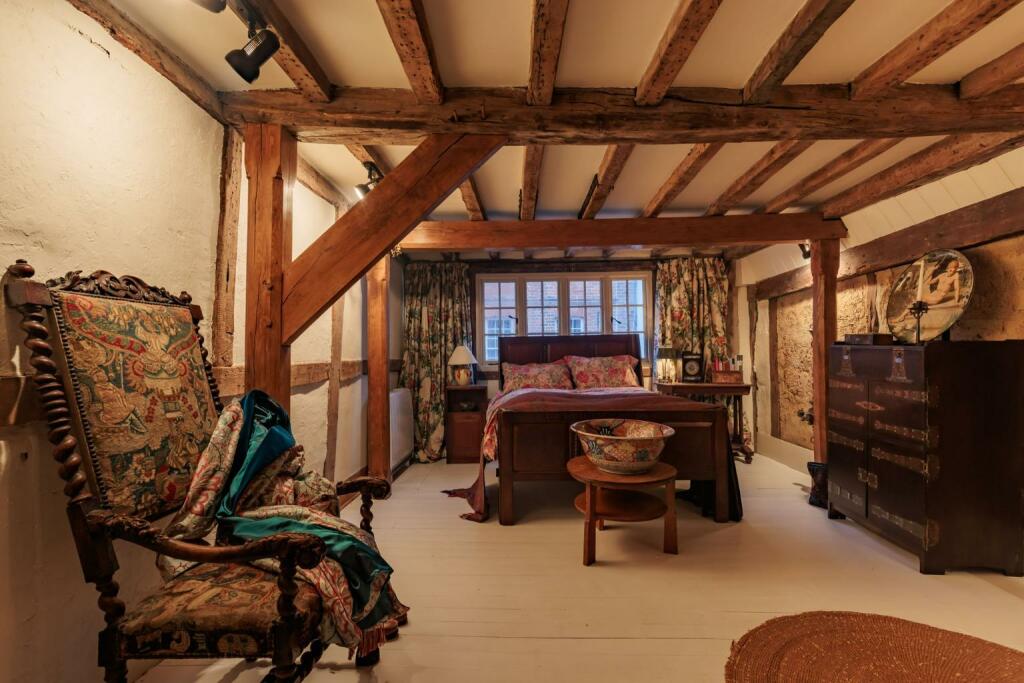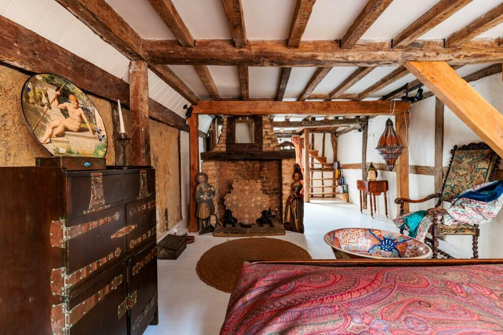 The property itself is a Grade II Listed building, dating back to the mid-15th century, with various alterations and renovations throughout its history. The images show a property that retains many original features, including exposed beams, and fireplaces. While the property appears well-maintained and in good condition, certain aspects may require ongoing upkeep due to its age and historic nature. The interior decor is eclectic and reflects the property’s character.