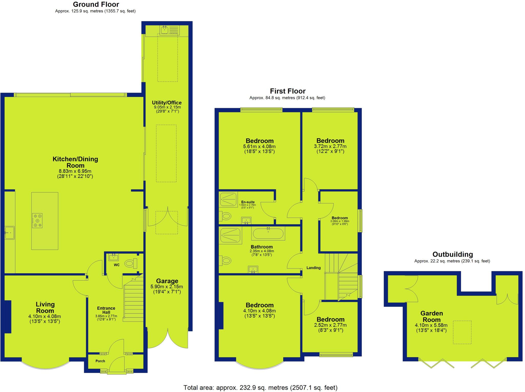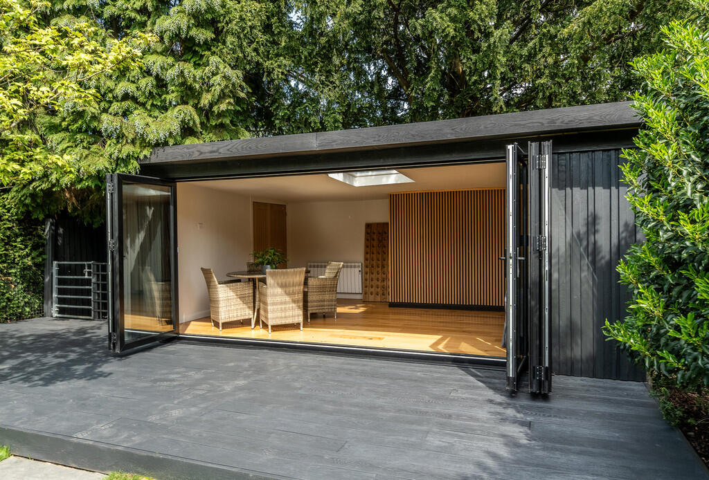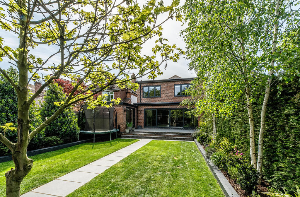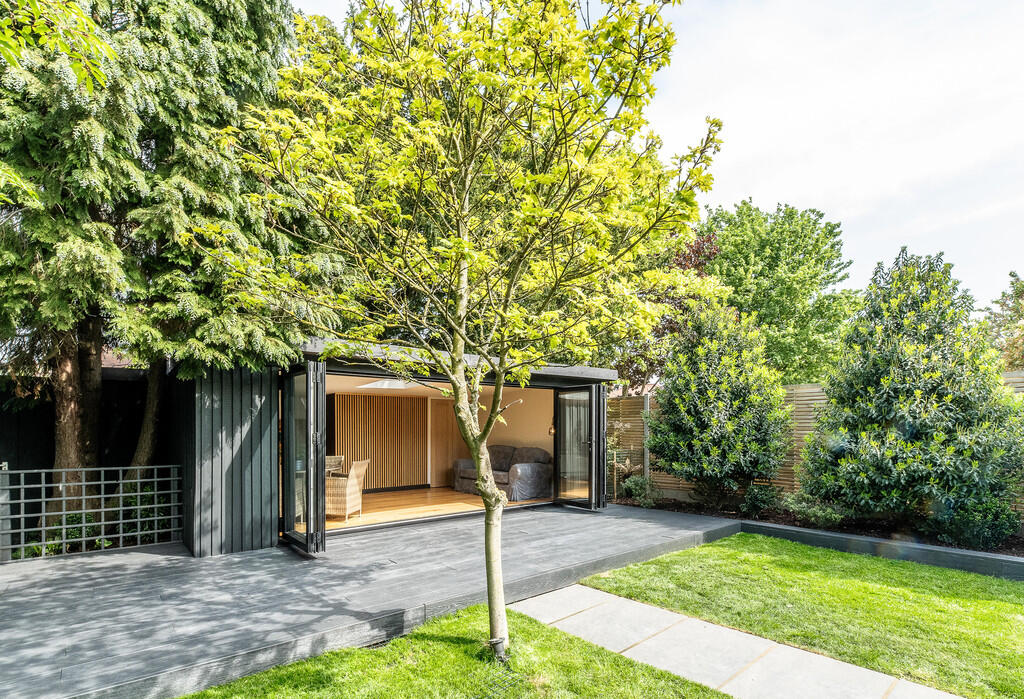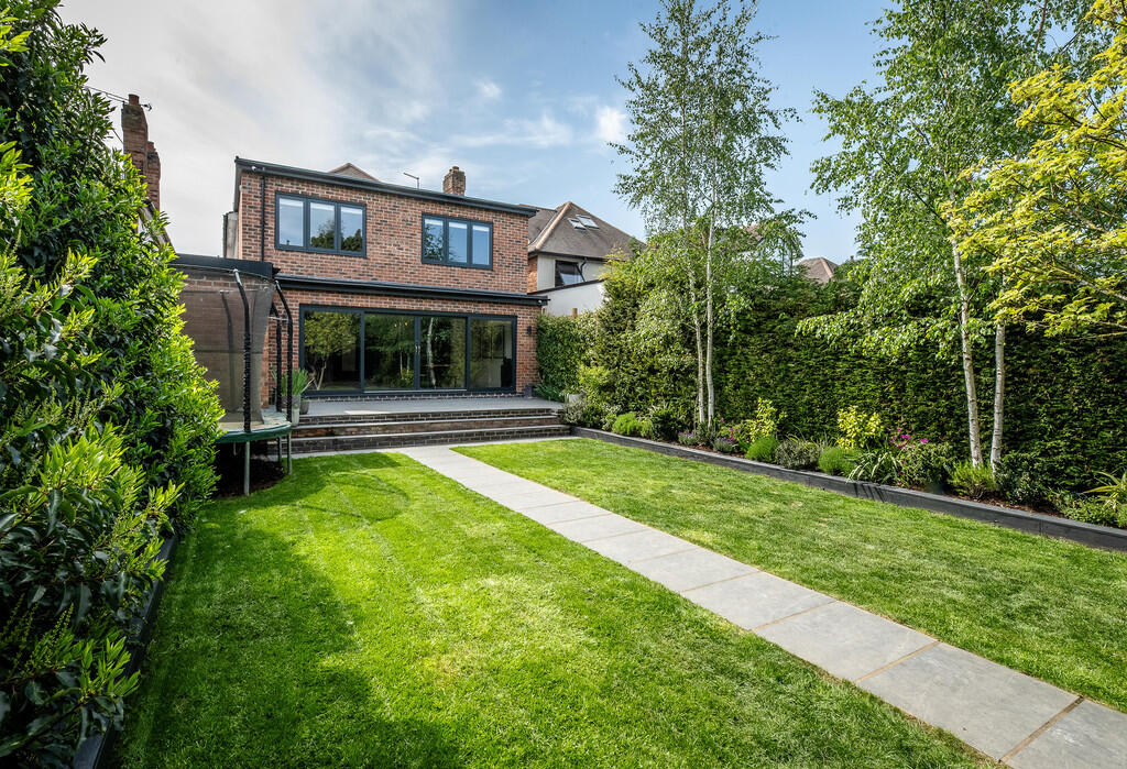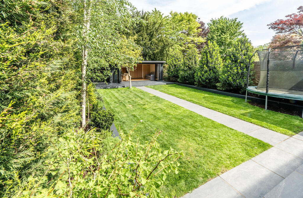 The property includes a substantial garden, which is well-landscaped and features a modern garden room/studio. The garden is a significant asset, offering considerable outdoor space and privacy.