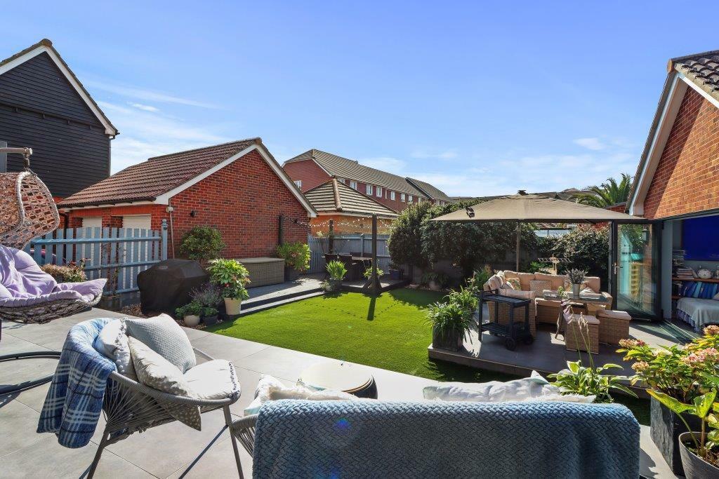This 5-bedroom, 2-bathroom house situated in Palmyra Place, Sovereign Harbour, Eastbourne, presents itself as a modern, well-maintained property. The photos reveal a recent renovation or new construction, evident in the contemporary kitchen, bathrooms, and overall interior design. The open-plan living space creates a spacious feel, and the bi-fold doors lead to a large, well-landscaped garden with multiple patio and decking areas, ideal for outdoor living and entertaining. The location in Sovereign Harbour provides proximity to Eastbourne’s coastline and marina. While the immediate surroundings of the property might be somewhat limited in terms of nearby shops or other attractions, the overall area and proximity to amenities, particularly good schools, are appealing factors. The listed price requires further investigation relative to comparative sales data of similar sized and finished properties in the same street, to fully assess the value for money. In the immediate area, the property appears slightly higher priced than some others, but this does not take into account the quality and extent of work done. The lack of a recorded plot size in the data also makes the value for money assessment challenging. Overall, it represents an attractive option for those seeking a modern, spacious home in a coastal location.