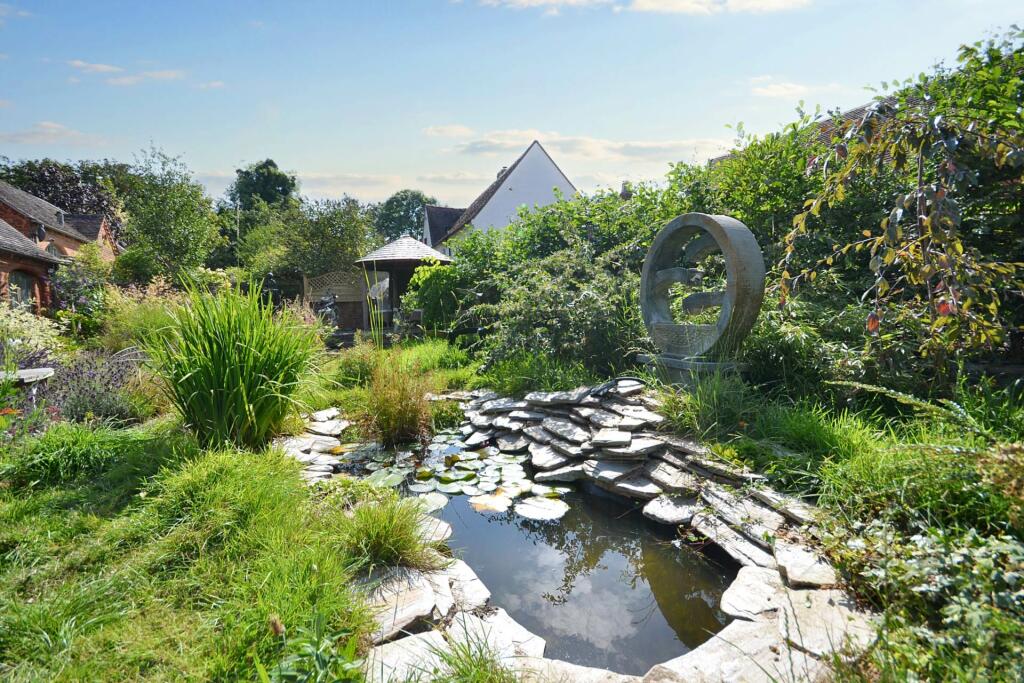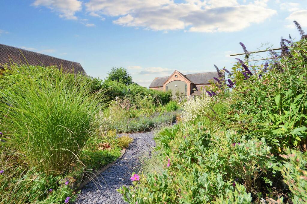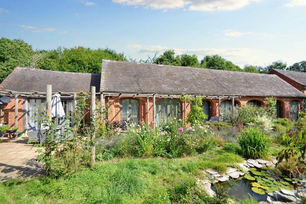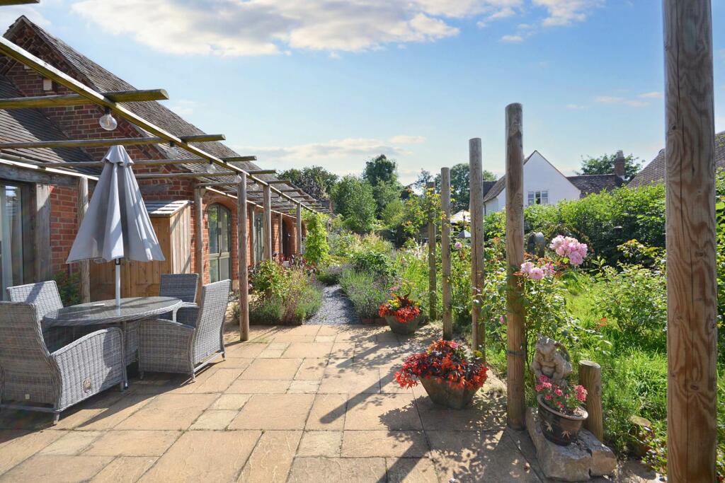 This property is a charming Grade II listed three-bedroom barn conversion located in the desirable area of Puckrup, Tewkesbury, Gloucestershire. The conversion appears to have been executed to a high standard, resulting in a modern and stylish interior. The property benefits from a well-maintained and beautifully landscaped garden, which includes a variety of mature plants and attractive features such as a gazebo and pond. The interior boasts exposed beams, a stylish kitchen with high-end appliances, and generously sized rooms. The overall impression is of a well-presented property with many appealing features.