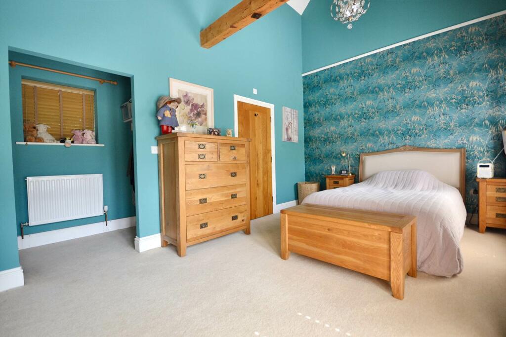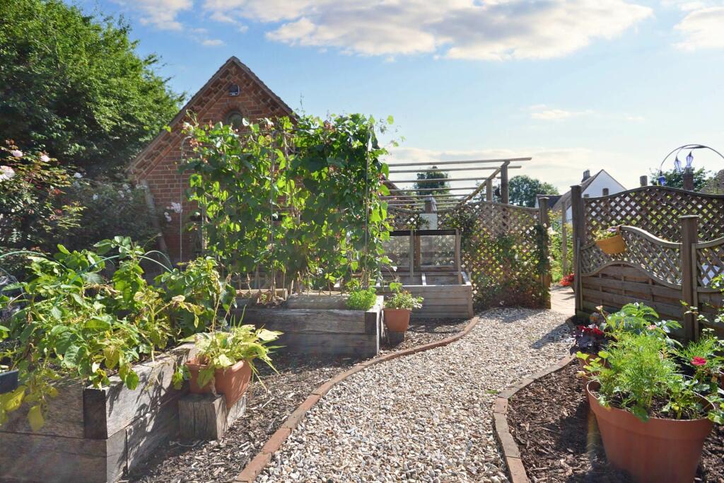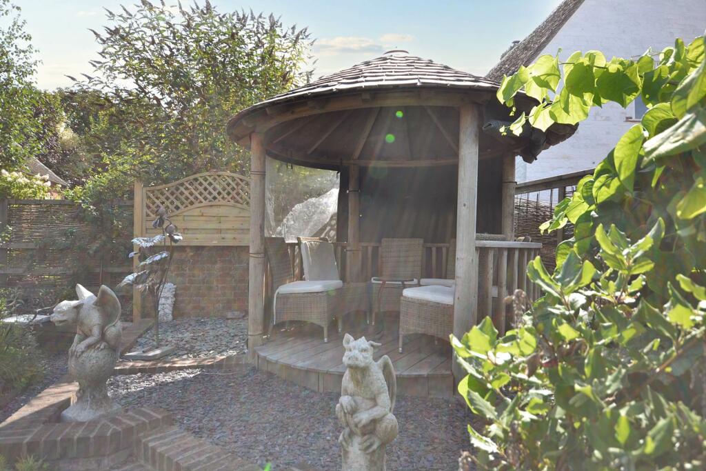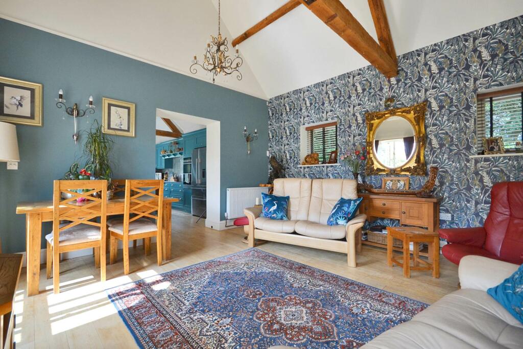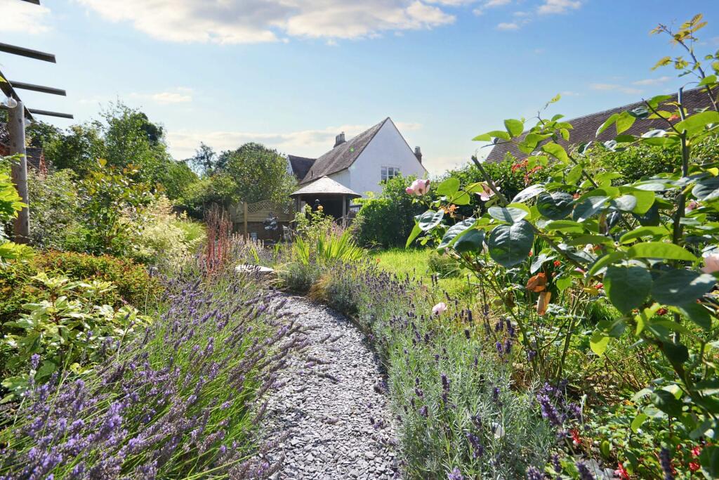 This property is a charming Grade II listed three-bedroom barn conversion located in the desirable area of Puckrup, Tewkesbury, Gloucestershire. The conversion appears to have been executed to a high standard, resulting in a modern and stylish interior. The property benefits from a well-maintained and beautifully landscaped garden, which includes a variety of mature plants and attractive features such as a gazebo and pond. The interior boasts exposed beams, a stylish kitchen with high-end appliances, and generously sized rooms. The overall impression is of a well-presented property with many appealing features.