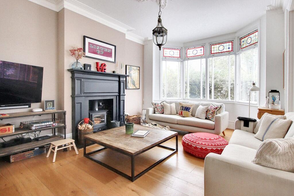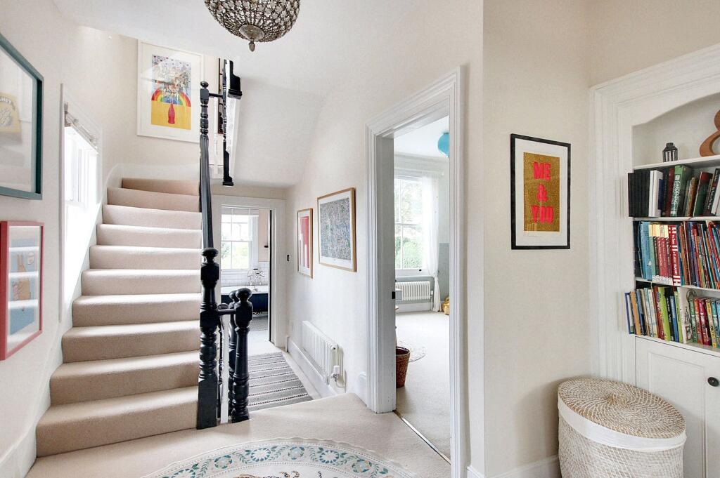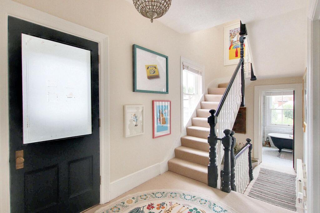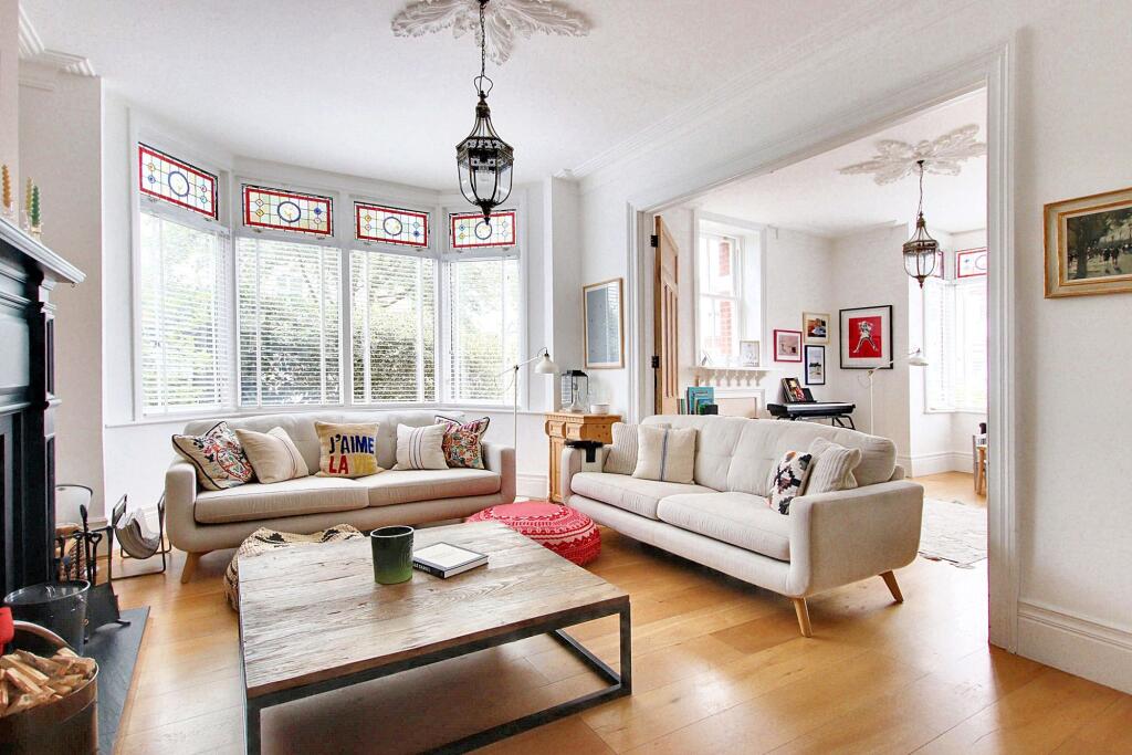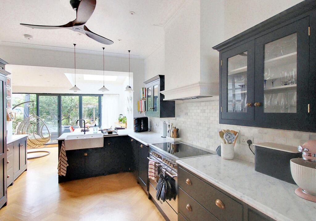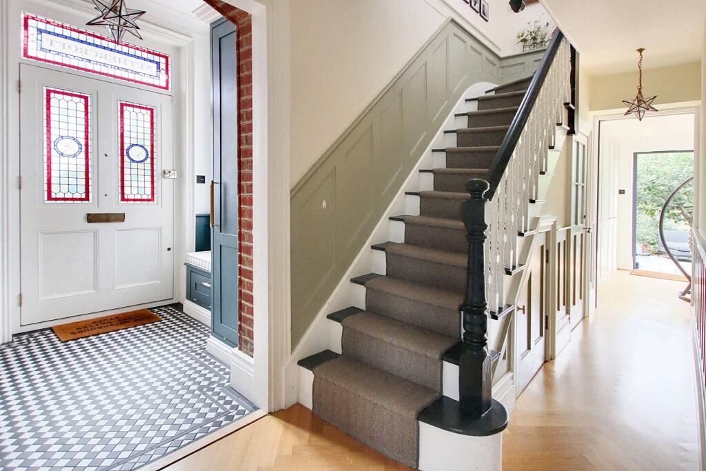 Exceptional character residence with six bedrooms, 'Devol' fitted kitchen, stunning reception rooms, high-end finish, luxury bathrooms, off street parking, close to schools, High Street, and Station