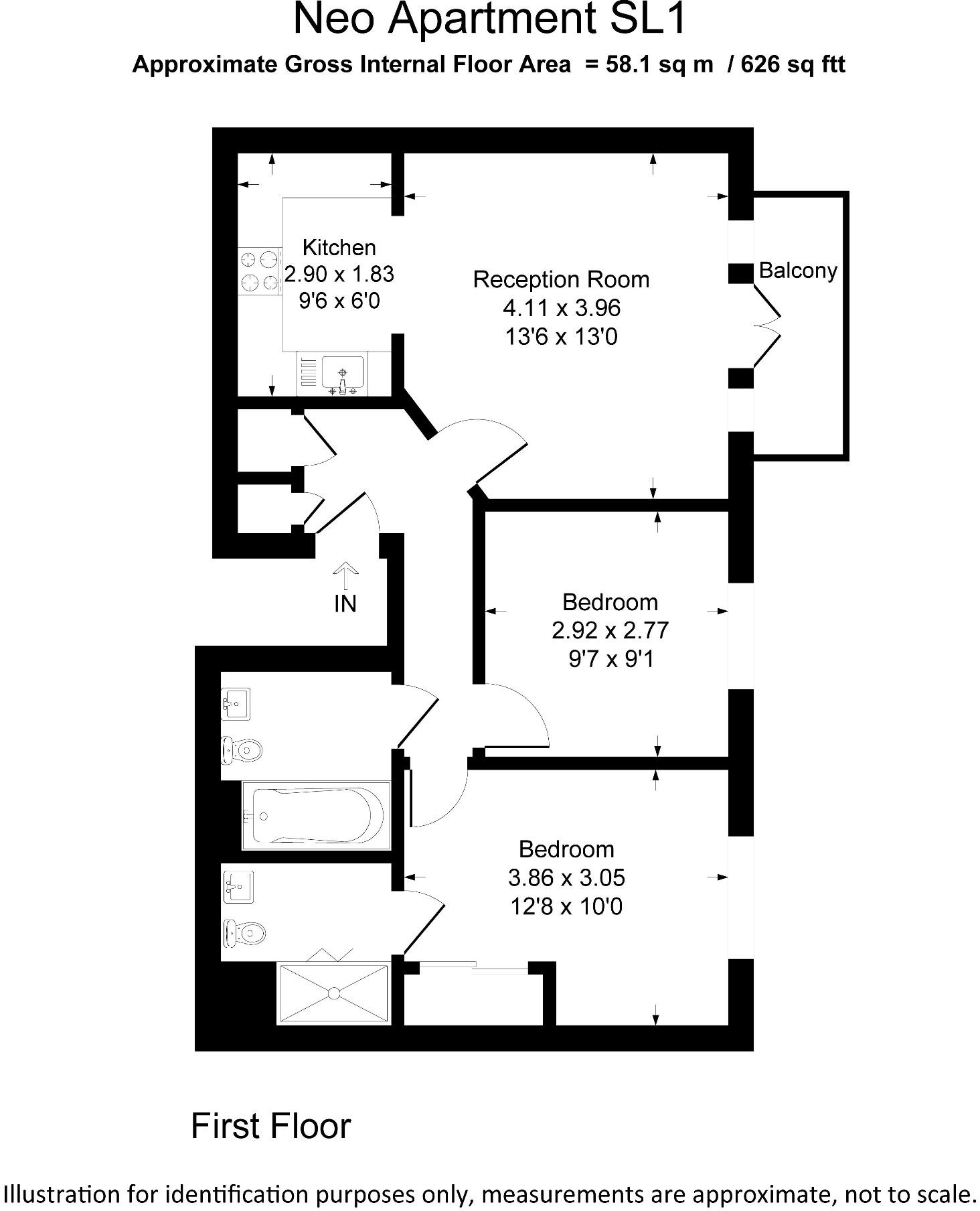Focus Residential are please to offer for sale this 2 bedroom 2 bathroom first floor apartment with parking and balcony. Accommodation comprises entrance hall, lounge/dining room, kitchen, master bedroom with ensuite shower room, bedroom 2, bathroom, parking, balcony, heating, double glazing. Call Focus Residential.<br /><br /><b>Communal Entrance Hall</b>:<br />With entryphone system.<br /><br /><b>Inner Hall</b>:<br />Cupboard housing hot water tank, storage cupboard, electric heater.<br /><br /><b>Lounge</b><br />13' 6" (4.09m) x 13' 0" (3.99m)::<br />Double glazed door to large balcony, fitted carpet, tv point.<br /><br /><b>Kitchen</b><br />9' 6" (2.90m) x 6' 0"" (1.83m)::<br />Range of wall and base unit, laminated bevelled work surfaces, sink with single drainer, oven, hon and extractor, plumbing for dishwasher and washing machine, tiled surrounds, space for fridge freezer.<br /><br /><b>Bedroom One</b><br />12' 8" (3.86m) x 10' 0" (3.02m)::<br />Front aspect double glazed window, electric heater, built in wardrobe.<br /><br /><b>En Suite Shower Room</b>:<br />With large shower with tiled surrounds, low level wc, hand basin, heated towel rail, spot lighting.<br /><br /><b>Bedroom Two</b><br />9' 7" (2.92m) x 9' 1"" (2.77m)::<br />Front aspect double glazed window, fitted carpets.<br /><br /><b>Bathroom </b>:<br />Suite comprising side panel bath, low level, wc, hand basin, tiled surrounds, heated towel rail, spot lighting.<br /><br /><b>Parking</b>:<br />Allocated gated parking.<br /><br /><b>Lease Details</b>:<br />Lease Length 107 years<br />Service Charge Approx £230 per month.<br />Ground Rent £275 per annum