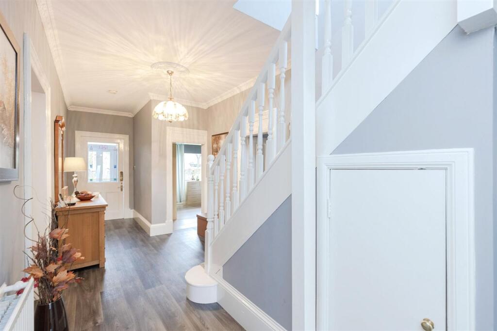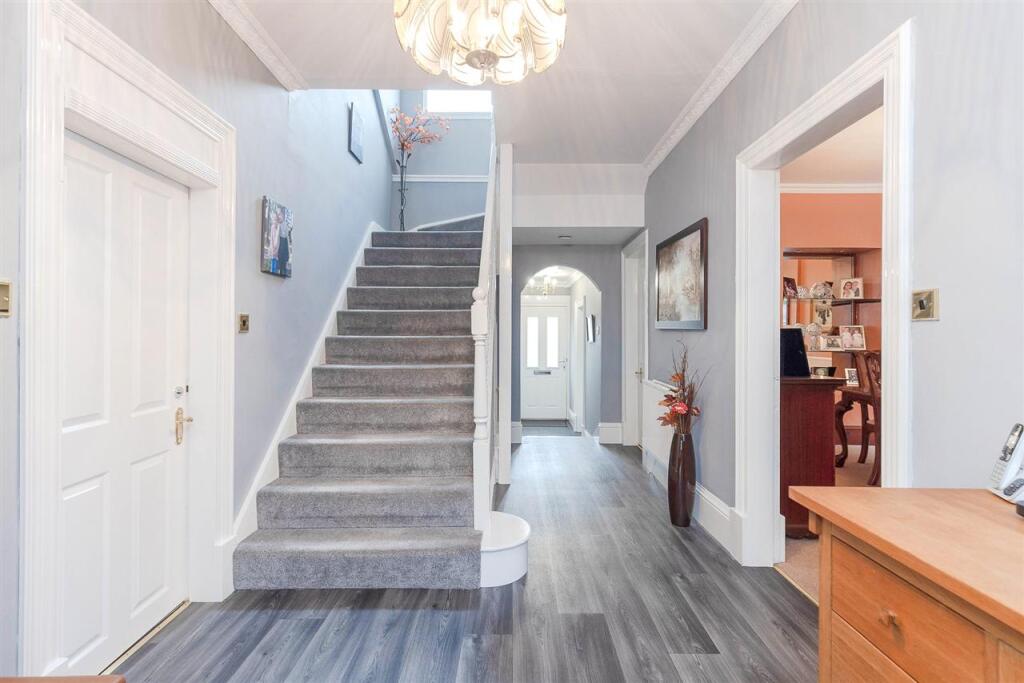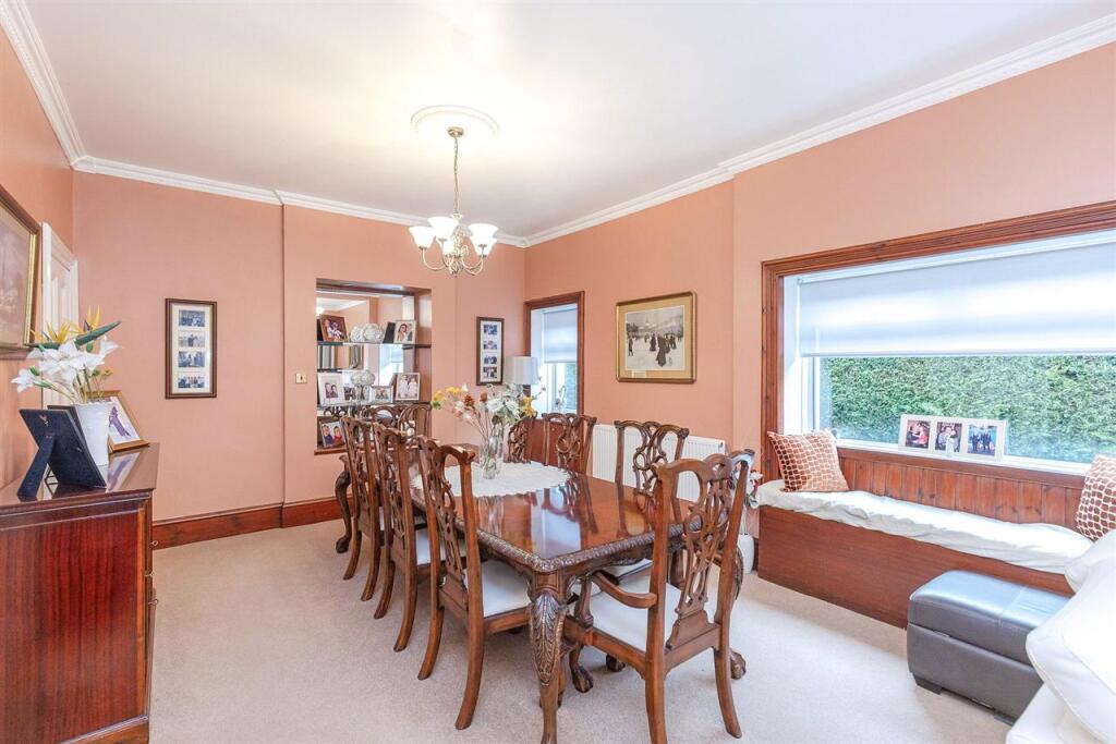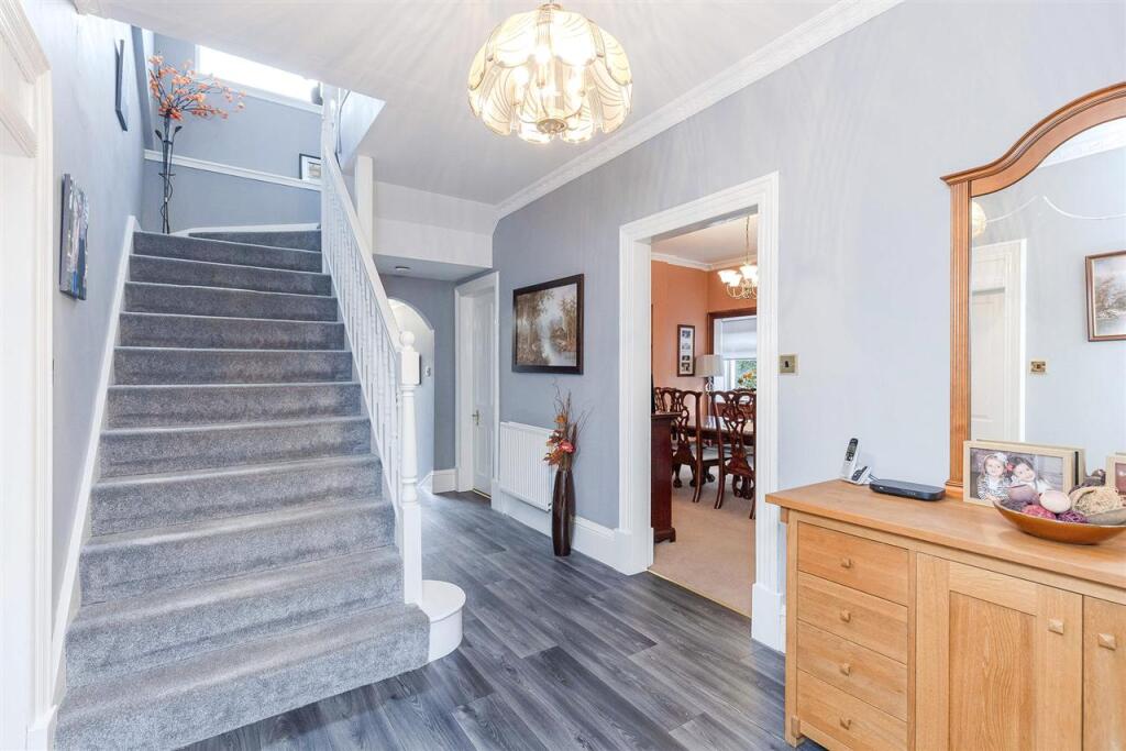 The property appears to be well maintained and presented to a high standard. The images show a modern fitted kitchen, multiple bathrooms and well-proportioned bedrooms. The property also benefits from a sizeable garden and detached garage.