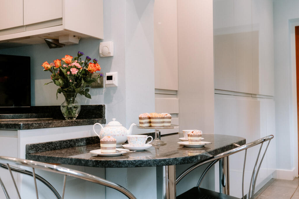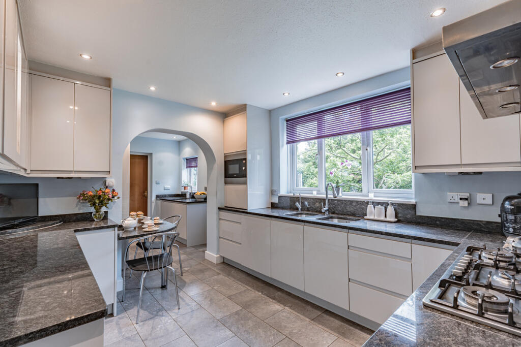 The property boasts a modern kitchen with granite countertops and modern appliances, as well as what appears to be recently updated bathrooms. The interior decor is relatively modern in some areas. The property also has a sizable garden, creating a tranquil environment. A family-friendly environment, combined with modern comforts, creates a suitable property for a family.
