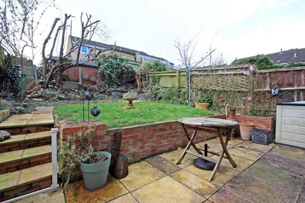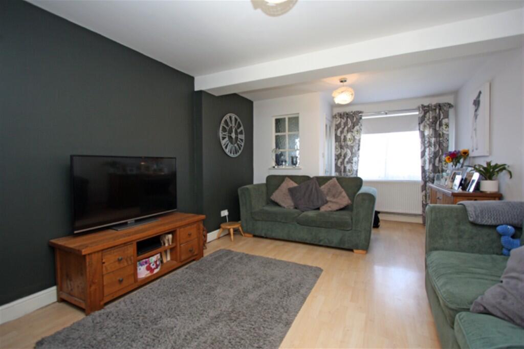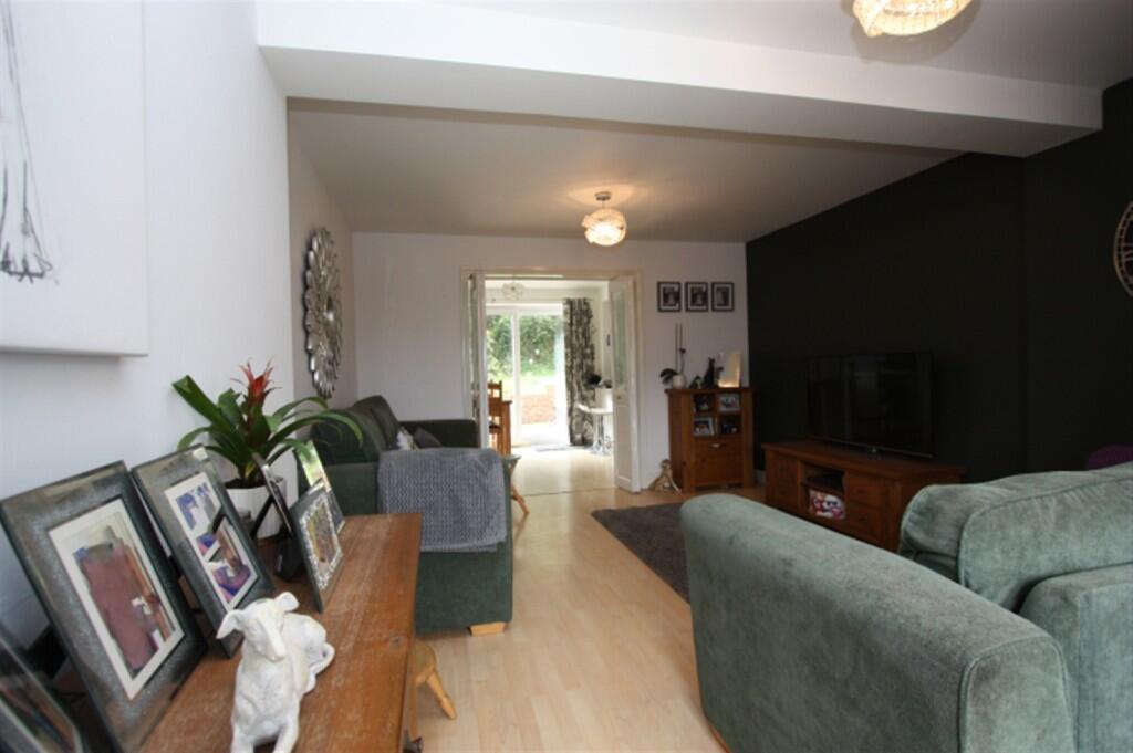 An extended three bedroom terraced house offering spacious well presented accommodation with a SOUTH FACING rear garden. Kitchen/dining room, spacious living room. Bathroom with shower over the bath. Garage and driveway. Gas radiator central heating and double glazing.