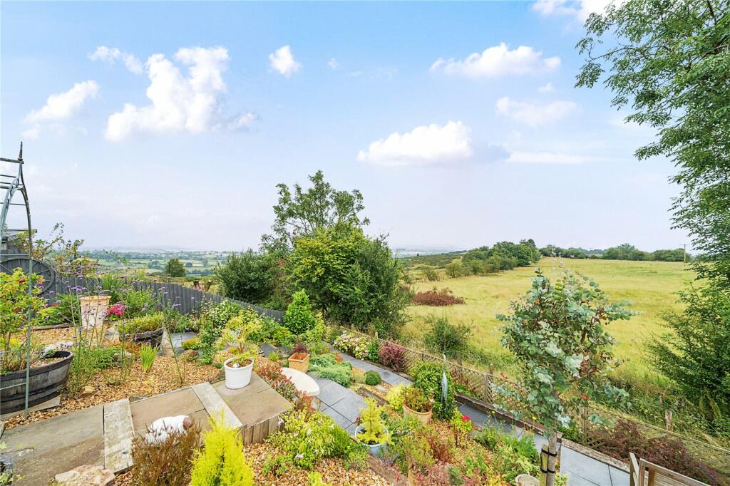 This immaculately presented two-bedroom detached bungalow in Clee Hill, Shropshire, offers a blend of modern comfort and stunning countryside views. The property’s interior is bright, spacious, and features a contemporary open-plan kitchen and living area with a wood-burning stove, creating a cosy atmosphere. The kitchen itself is well-equipped with modern appliances and plenty of storage. The two double bedrooms are generously sized and stylishly decorated. A conservatory opens onto the extensive, multi-tiered garden which is a clear highlight of the property. The garden is maturely landscaped and boasts impressive panoramic views of the Shropshire countryside. The attached garage adds extra convenience and storage. While precise plot size is missing from the information provided, the visual evidence clearly suggests a significant amount of outdoor space. The property’s location in Clee Hill provides a peaceful rural lifestyle, yet remains within a reasonable distance of the amenities of Ludlow and has a good-rated primary school nearby, making it an attractive option for families. In terms of value, the listing price seems fairly competitive with other bungalows in the area, although a detailed price per square foot analysis would require more complete data on nearby comparable properties.