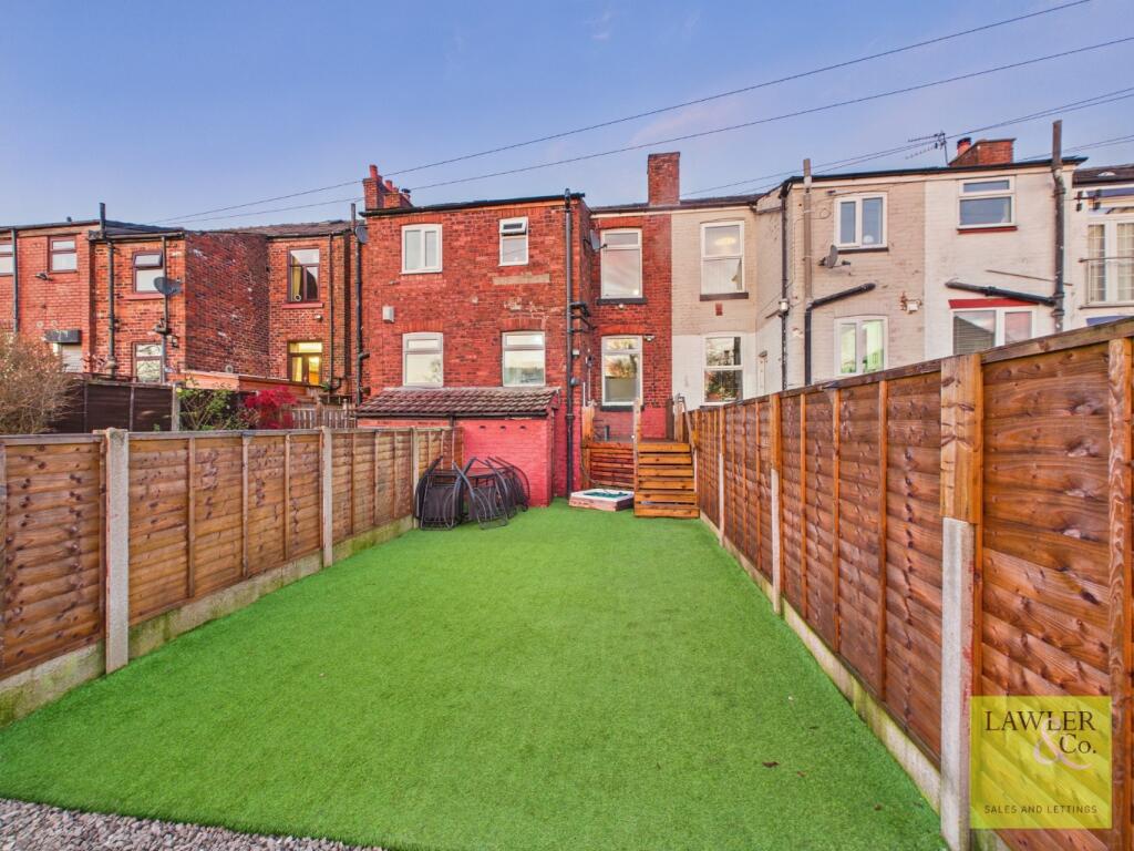 This is a terraced property located on Hall Street in Stockport. It features two bedrooms and two bathrooms. The property appears to be in good condition, with modern interior design. It also benefits from a rear garden. The location is convenient, with nearby schools and transportation links. The asking price of £220,000 seems reasonable considering the property’s size, condition, and location within Stockport. It is listed with Lawler & Co estate agents.