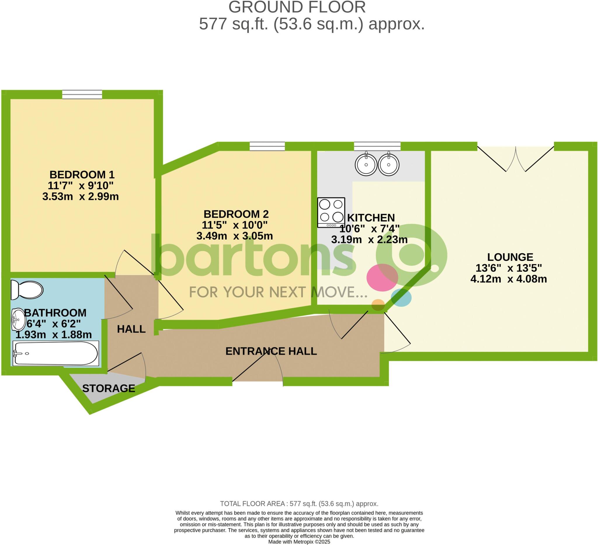 This is a two-bedroom flat located in Woodlaithes Village, Wickersley North, Rotherham. The property is listed by Bartons and has a list price of £110,000. The flat is situated in a residential area with access to local schools and transport links. While the property requires some modernisation, it represents a reasonable opportunity for first-time buyers or investors. The proximity to good schools is a plus, and the price point seems competitive for the area. However, the lack of private outdoor space may be a drawback for some buyers.
