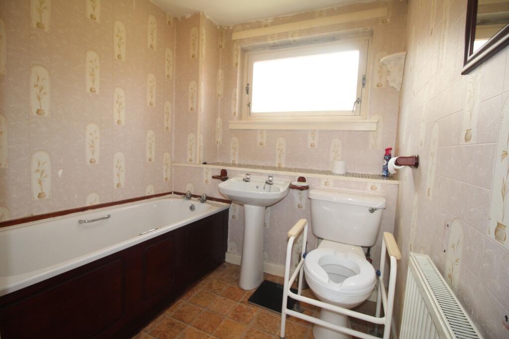 This property is a 2-bedroom flat located in Glasgow, Scotland. The property is situated near the Forth and Clyde Canal Glasgow Spur Towpath and has convenient access to several ScotRail stations within a 2.59km radius. While specific details about nearby schools are unavailable, the area is served by Murano Street which has an average price of £121,667. The flat itself is 600 sqft and is listed at £125,000. The average price per sqft in the area is £294.00, and the average house price is £274,804. The property shows signs of needing some modernisation, particularly in the bathroom and some of the decor. The kitchen and living areas appear functional but dated. There is no outdoor space.