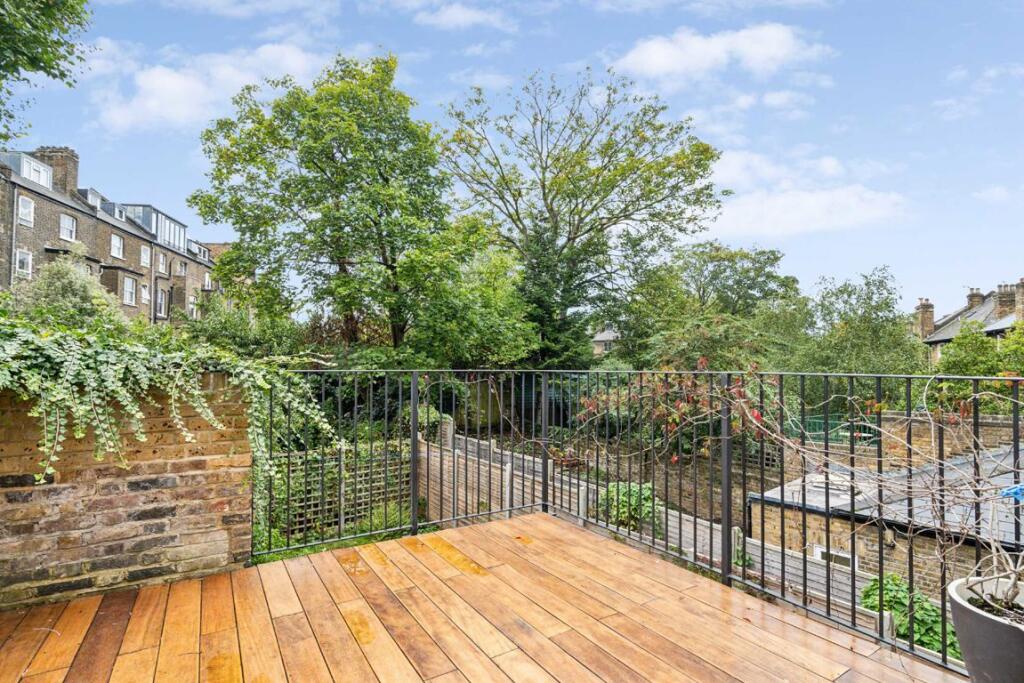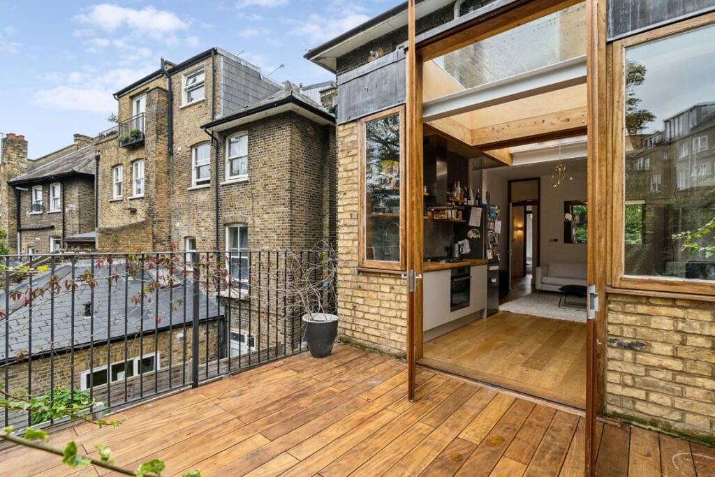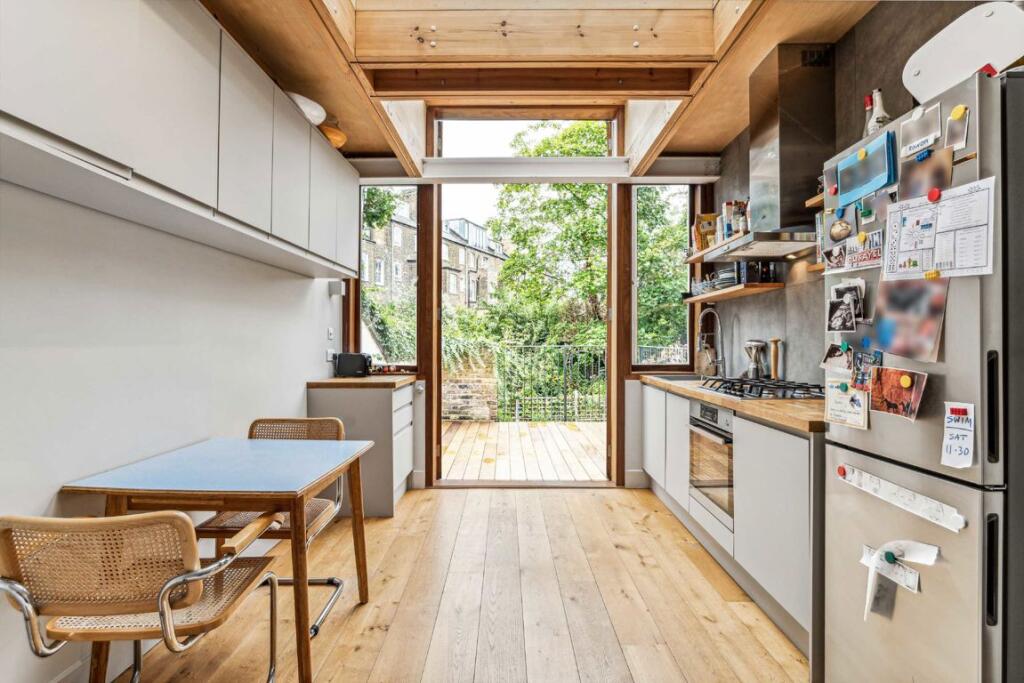 A unique Victorian two bedroom conversion with a study, featuring a layout that separates social and private areas. The high ceilings and skylights create a bespoke kitchen, complemented by clerestory windows and a south facing private terrace.