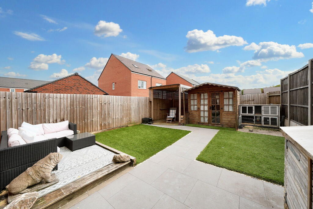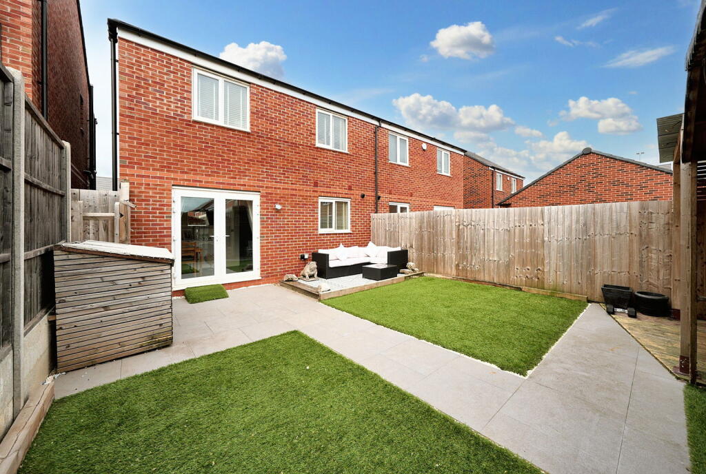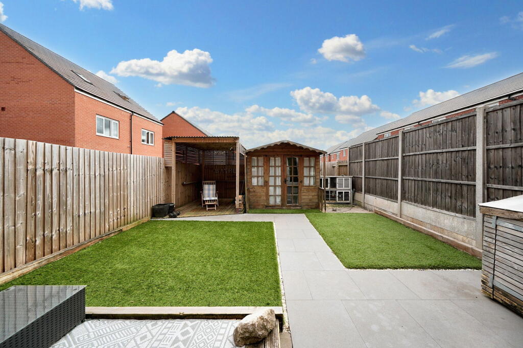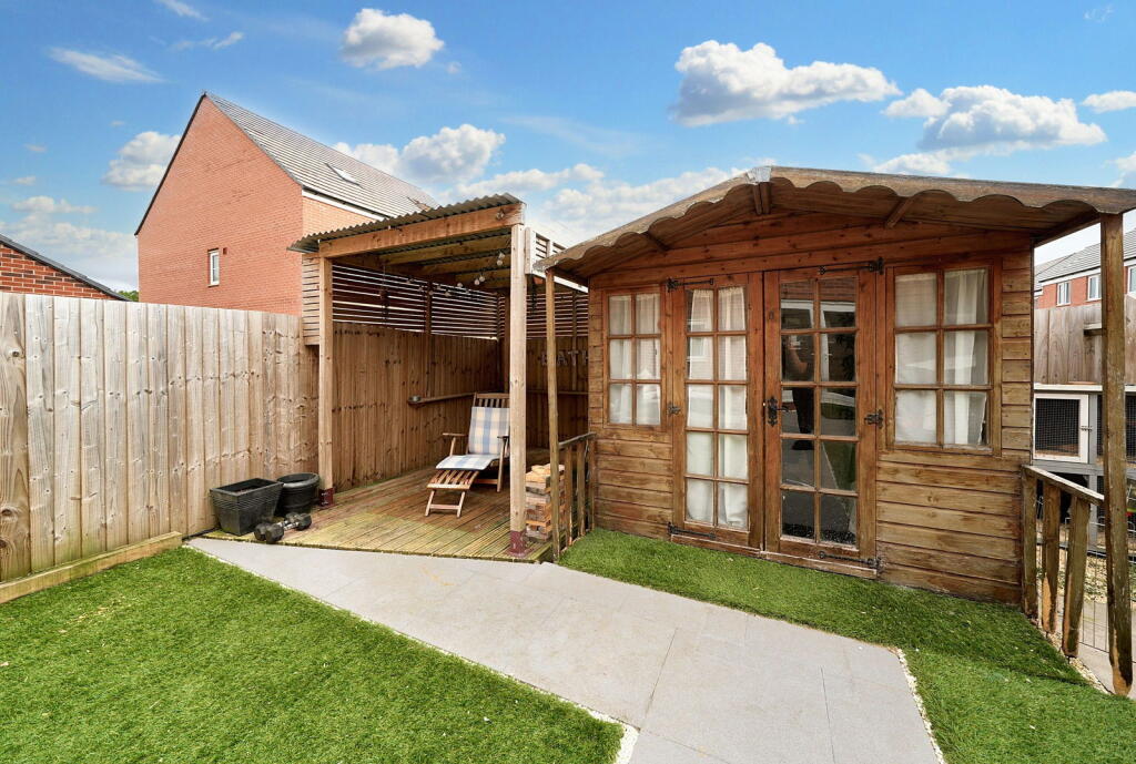 A modern, semi-detached property in Norton Canes, Cannock Chase. The house features three bedrooms, two bathrooms, and a well-maintained garden with a shed and covered seating. It is located near schools and train stations. The property is in good condition.