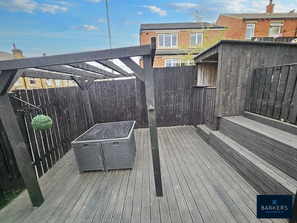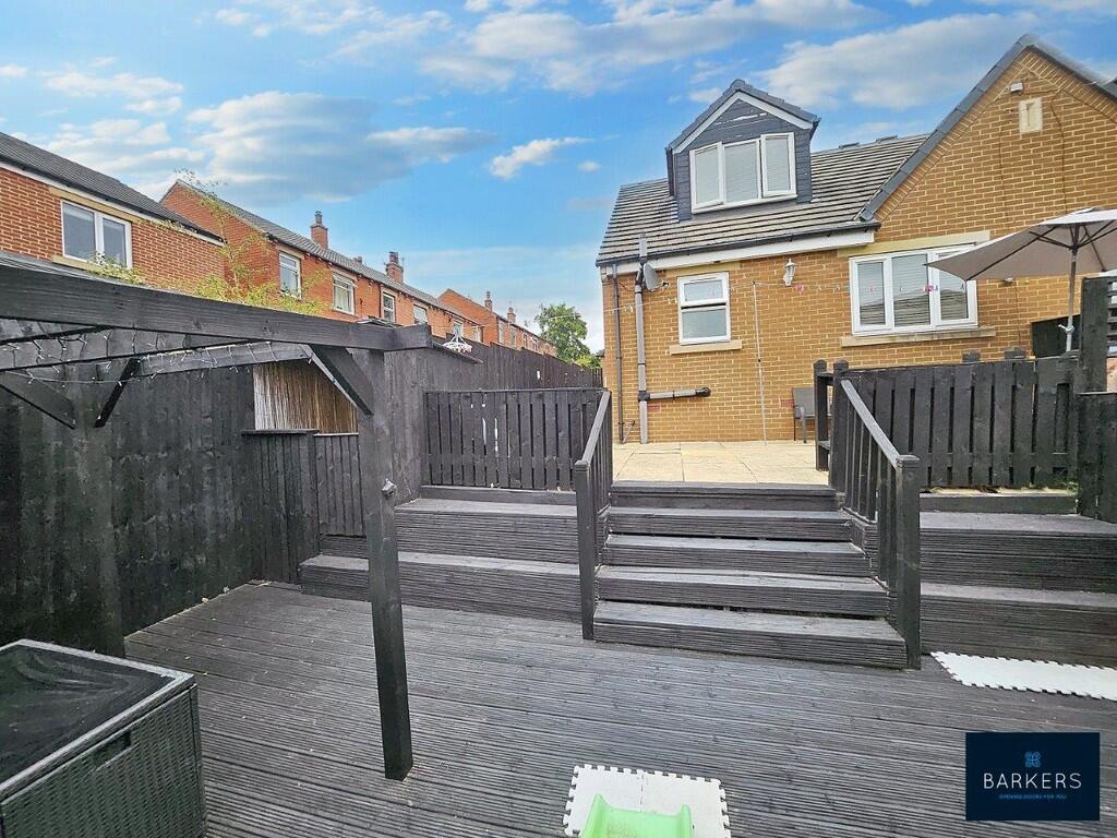 The property is a semi-detached house located in Batley, West Yorkshire. It features a modern kitchen and bathroom, and appears to be in good condition. The property includes a garden with paved and decked areas, and a garage. While the list price is above the local average per square foot, it aligns with the prices of similar nearby properties.