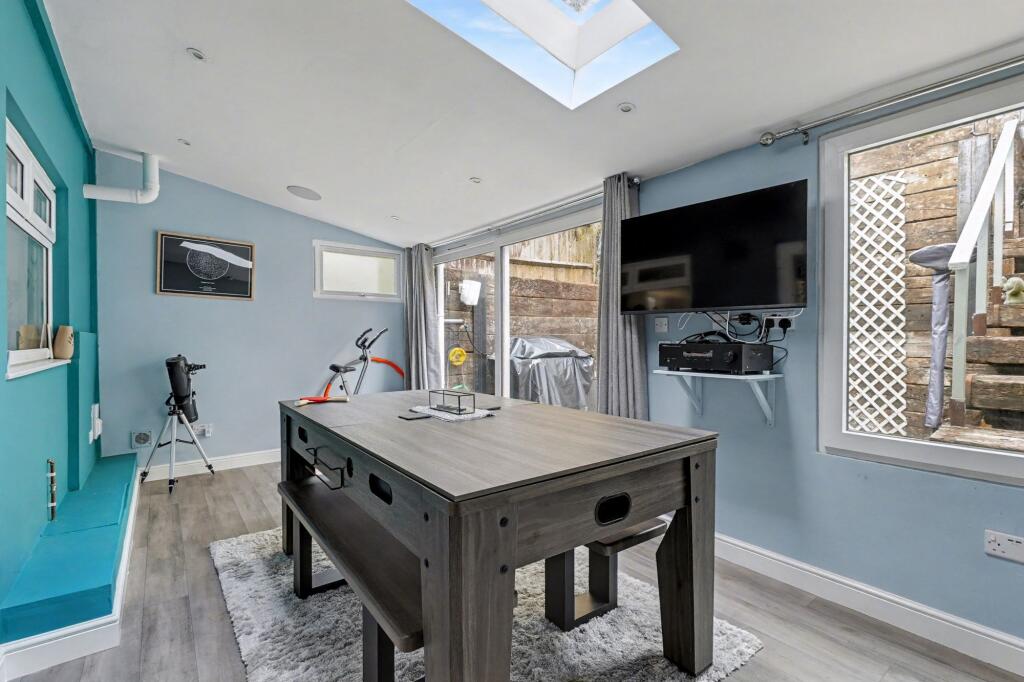 This is a three-bedroom terraced house on Princes Avenue, Walderslade, Chatham. The property benefits from a modern kitchen and bathroom, and a unique tiered garden featuring a shed converted into a bar. While the square footage is relatively small, the property appears to be well-maintained and offers multiple outdoor living spaces. The location is convenient for families, with several schools nearby. The price is slightly above the average for the area, potentially reflecting the condition and garden features.