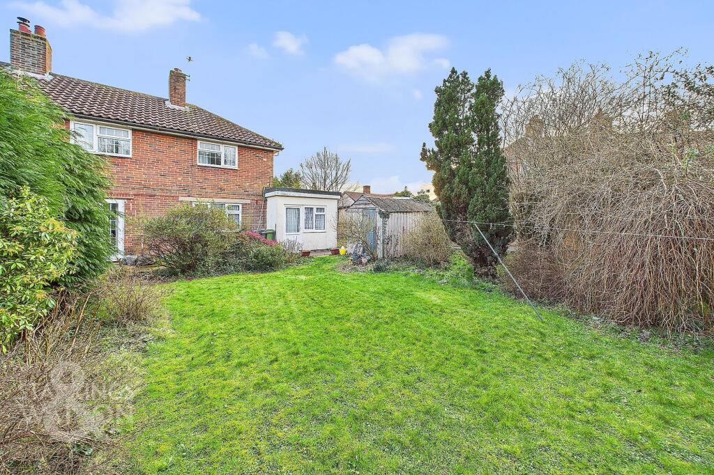 This is a three-bedroom semi-detached house located on Back Lane in Hethersett, South Norfolk. The property is listed for £300,000. The house is 858.42 sqft. The property benefits from a large garden. The property is located within close proximity to well-regarded schools. The house requires renovation and modernisation, particularly in the kitchen and bathroom. The property is reasonably priced compared to other properties in the area.