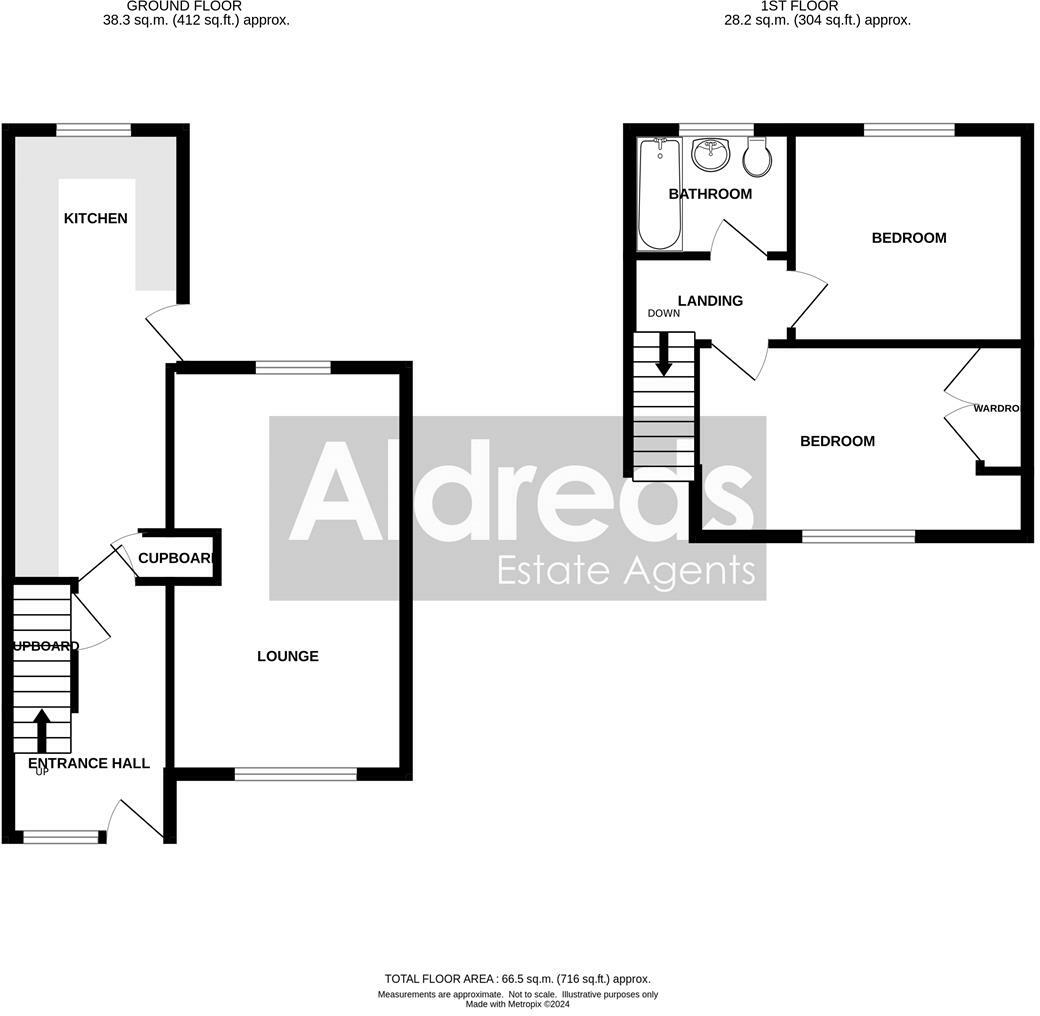 A well presented two bedroom semi detached house with garage and garden sitting in this convenient location. The property has an entrance hall, lounge, large kitchen and a first floor bathroom. Electric warm air heating and sealed unit double glazing.