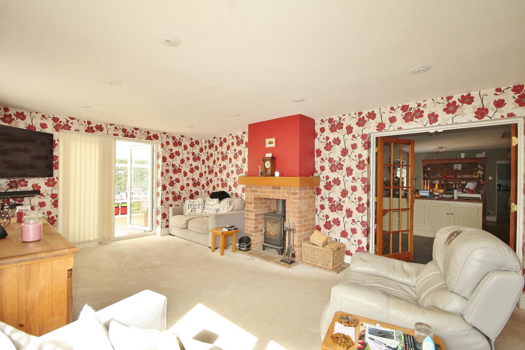 A detached bungalow set in large gardens, with a total plot size approaching 0.4 acre
