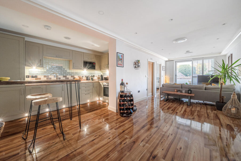 A beautifully presented one double-bedroom, first floor apartment in the heart of Farnham town centre. The accommodation is a stylish open-plan layout with polished wood floor, contemporary kitchen with integrated appliances and breakfast bar; fabulous, tiled bathroom; generous double bedroo...