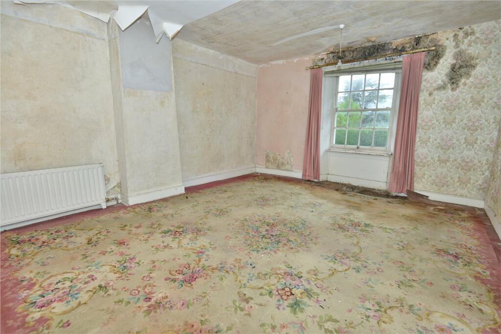 This property in Martin, New Forest, Hampshire, presents a unique opportunity for a buyer willing to undertake a substantial renovation project. The house itself is a four-bedroom, two-bathroom Georgian property with considerable character, but it is currently in a state of disrepair. The interior photos reveal significant damage, including peeling wallpaper, damp patches, and overall wear and tear. A complete refurbishment would be necessary to bring the property up to a modern standard.
