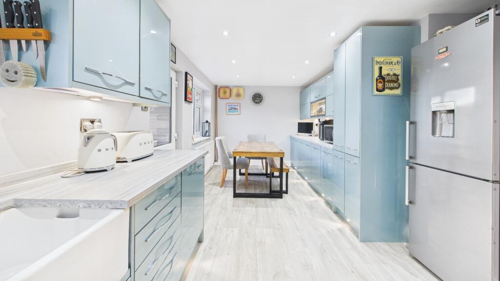 This is a three-bedroom end-of-terrace property in Etwall, Derbyshire. The property benefits from a recently renovated kitchen and bathroom, a large garden, and off-street parking. The property is located close to local schools and amenities. While the kitchen and bathroom have been modernised, the rest of the house is in need of some updating. The property is priced competitively for the area.