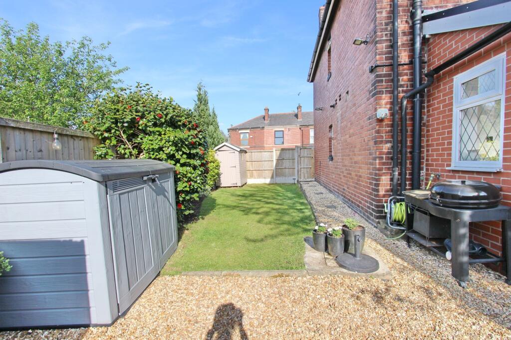The property includes a garden area, which is relatively small but provides some outdoor space. The garden is paved with gravel in some areas and has a lawn section, along with a shed.