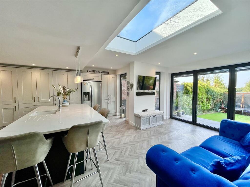 Lilac Cottage is a three-bedroom, two-bathroom semi-detached property situated on Morley Green Road in Wilmslow, Cheshire. The property benefits from a desirable location, offering a blend of semi-rural tranquility and convenient access to Wilmslow town centre, known for its excellent amenities and strong community feel. The provided photographs showcase significant recent renovations, resulting in a modern and stylish interior. The kitchen is the focal point, featuring contemporary cabinetry, high-quality worktops, and ample space for both cooking and entertaining. The extension provides a bright, open-plan space with bi-fold doors leading to the garden. The bathrooms also seem newly refurbished. The exterior is attractive, with a well-maintained front garden. The rear garden, while not extremely large, is spacious enough for comfortable family use, enhanced by a patio and decking areas. The presence of a garden shed adds practicality. The property is close to good schools and has convenient transport links, making it appealing to families and professionals alike. While the precise plot size is missing from the information, overall, Lilac Cottage is presented as a stylish and updated property in a prime Wilmslow location.
