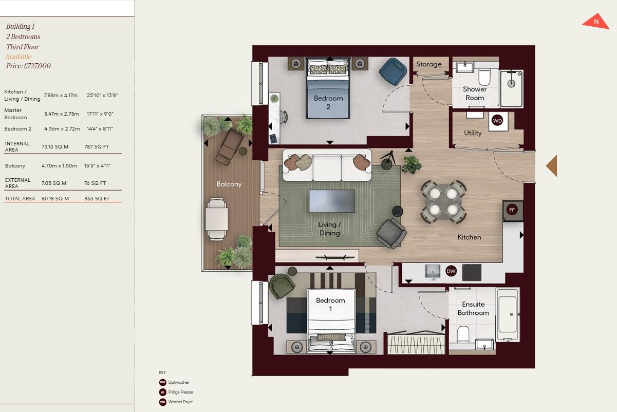 787 Sq Ft 2 Bedroom 2 Bathroom Apartment | 1st Floor | 76 Sq Ft Balcony | West Aspect | Ensuite In Principal Bedroom | Utility Cupboard | Underfloor Heating Throughout | 24 Hour Concierge | Cycle Storage | Residents' Landscaped Gardens | Gym -Powered By Peloton | Cinema with Bar Area | Co- Workin...