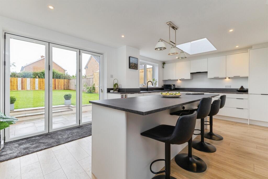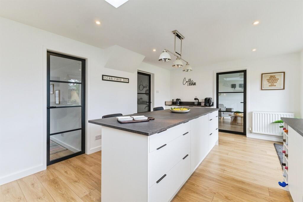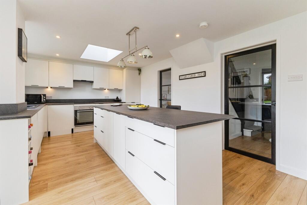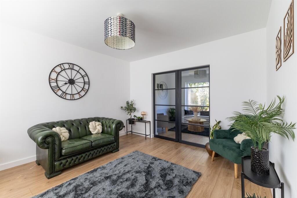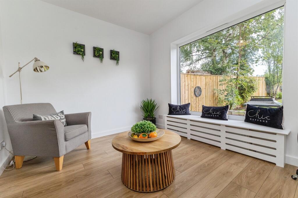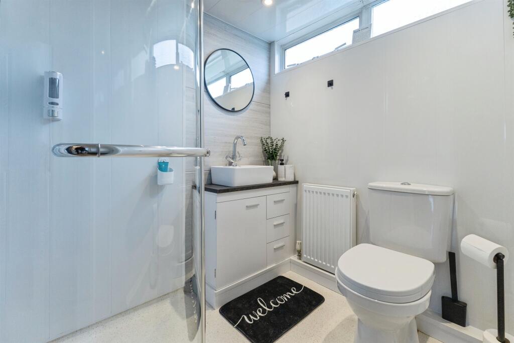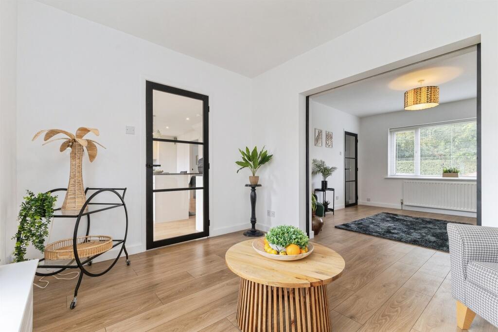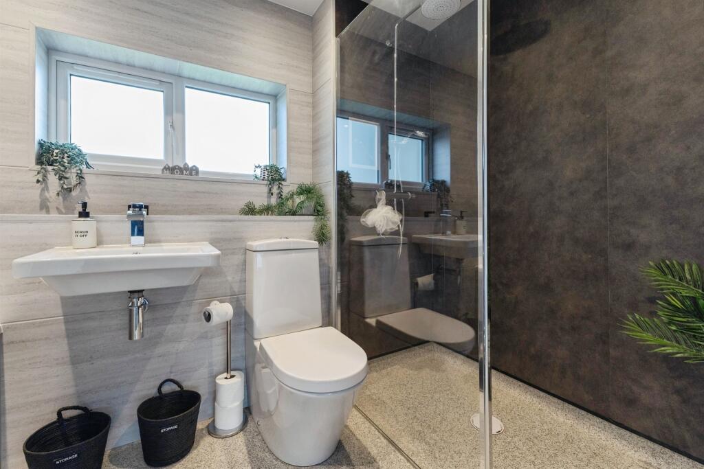 Step inside to a welcoming entrance hallway which leads to a contemporary downstairs shower room, a spacious lounge, and a light-filled dining room with a large window framing view of the stunning rear garden.