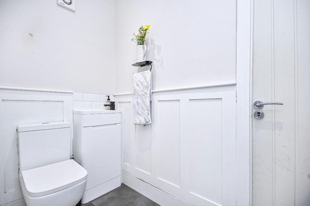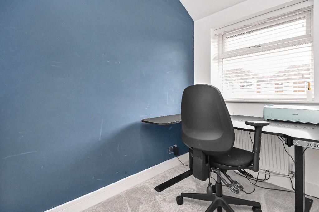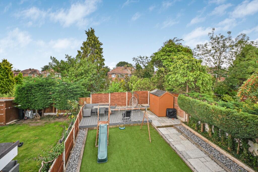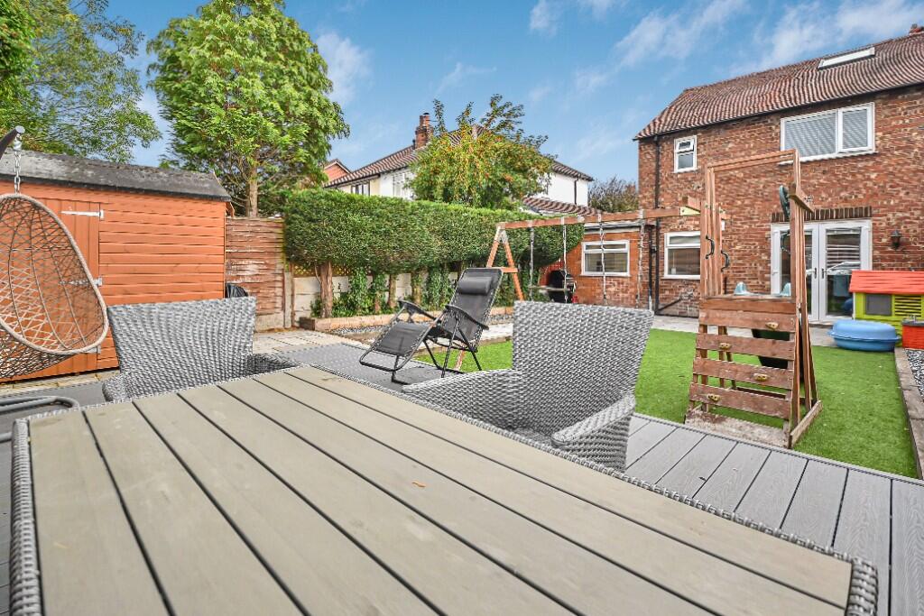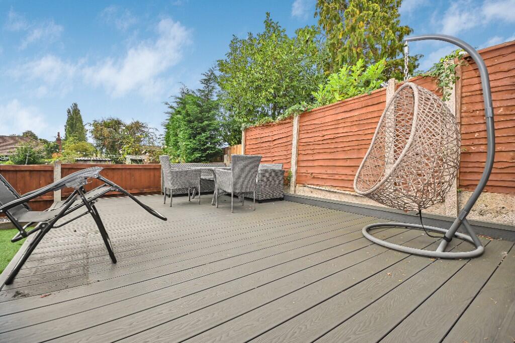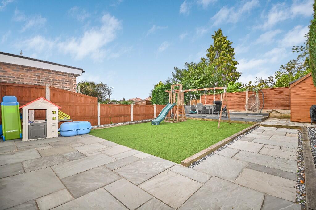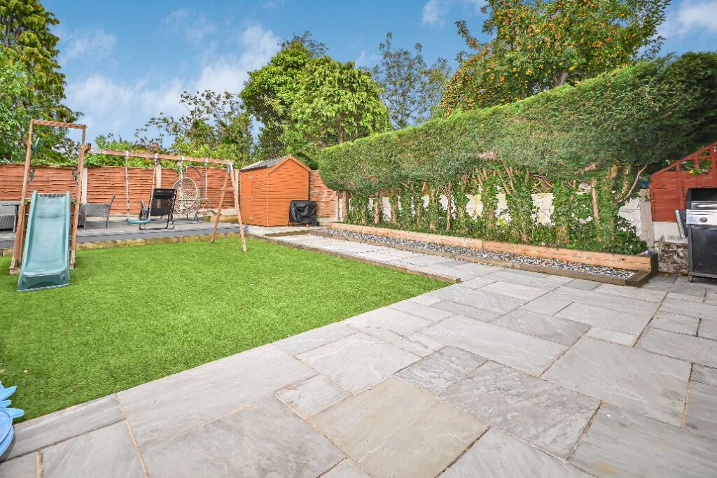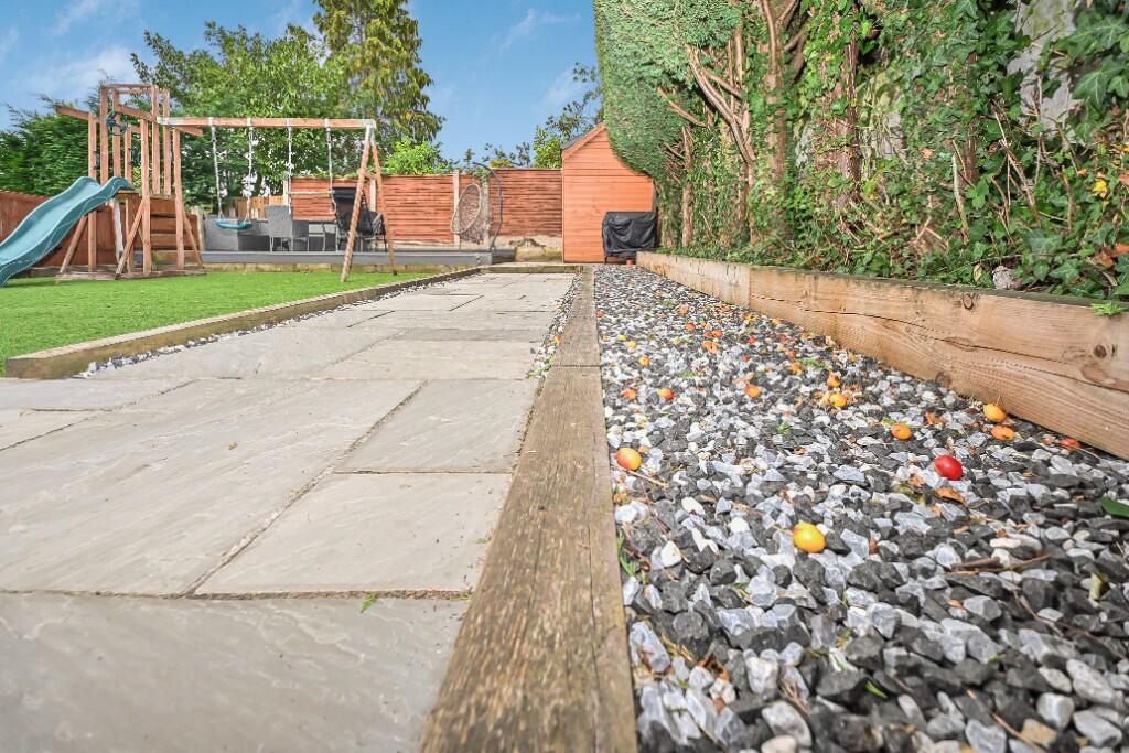 Outside, the property benefits from a driveway and a well-maintained rear garden. The garden includes a paved patio area, a section of artificial grass, a decked area, and a shed, offering a versatile outdoor space for relaxation and recreation.