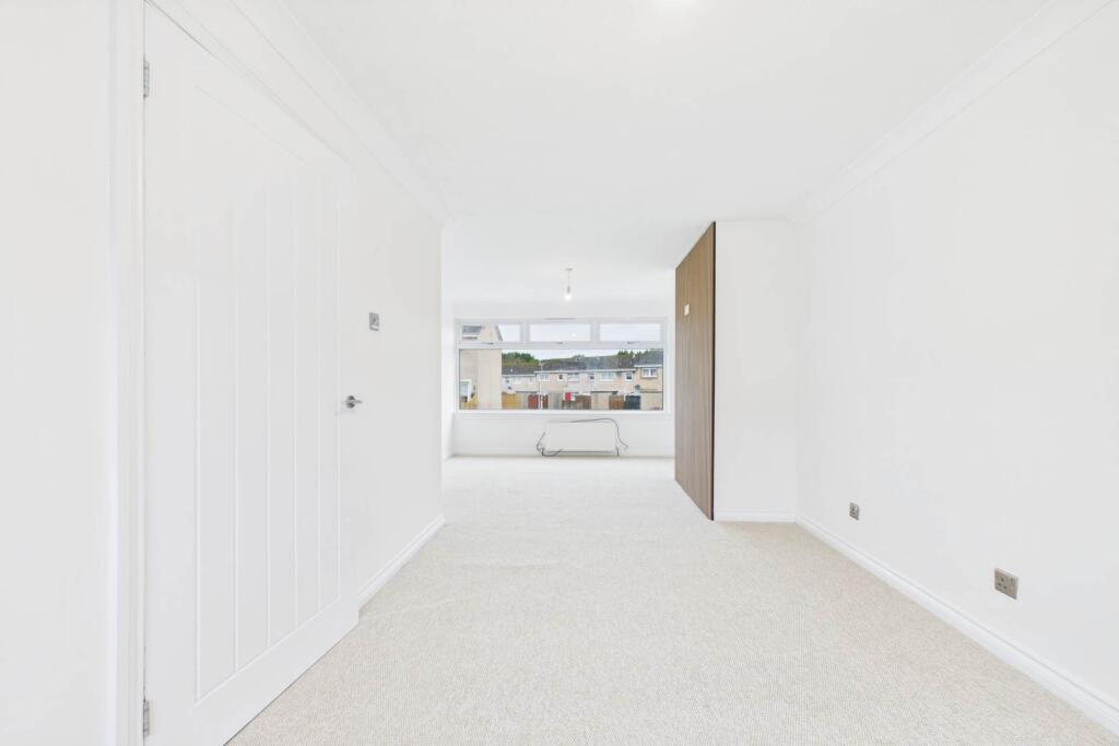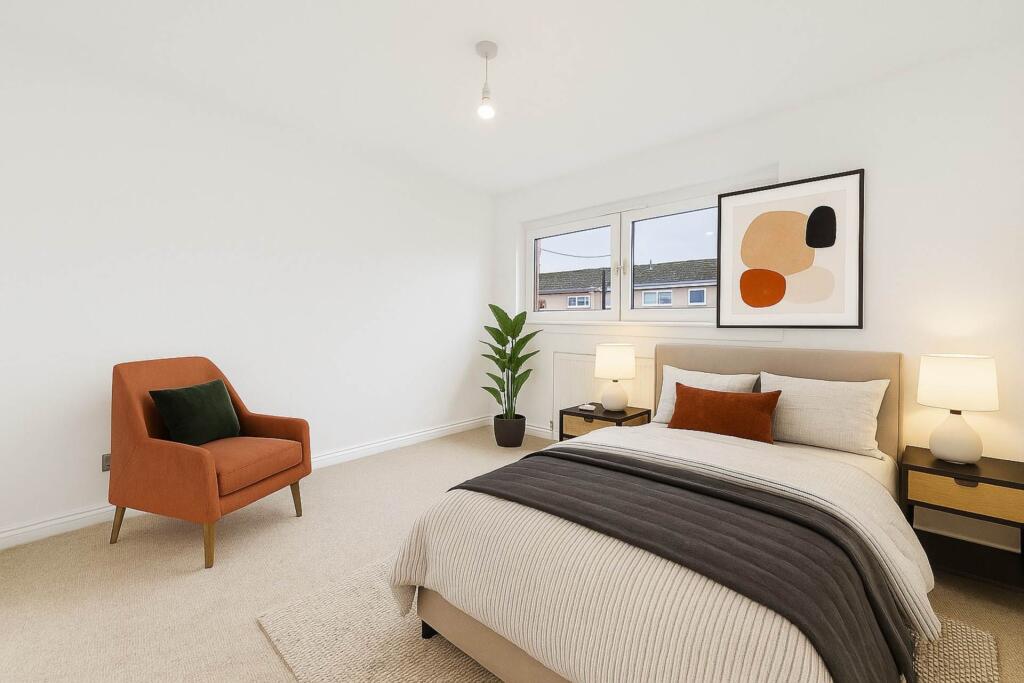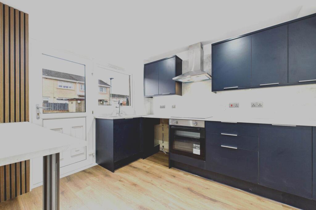This is a two-bedroom terraced house located in Burnside Crescent, Shotts. The property benefits from a modern interior, including a recently fitted kitchen and bathroom. It has front and back gardens. Shotts train station is 1.53km away. The listing price is £120,000.
