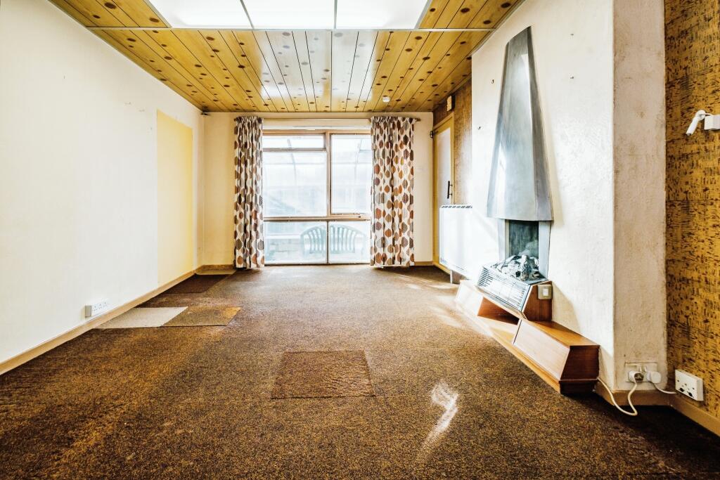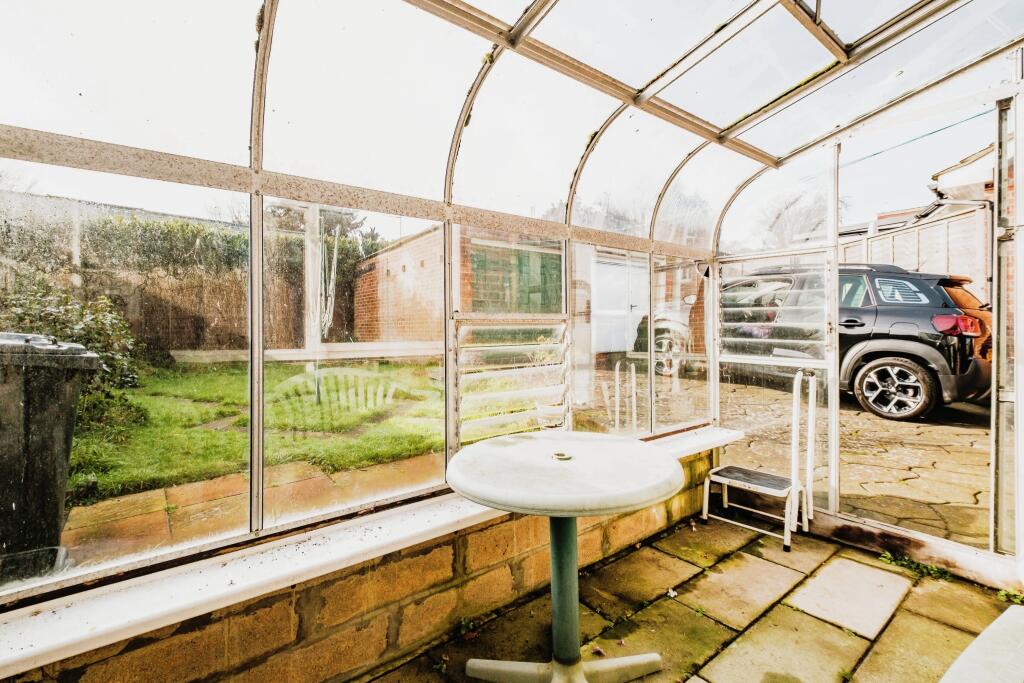The property benefits from a good-sized garden, including a greenhouse and garage. The images show that the property is in need of modernisation. The interior finishes, kitchen, and bathroom are dated and would require significant updating. The flooring and wall coverings are also showing their age.