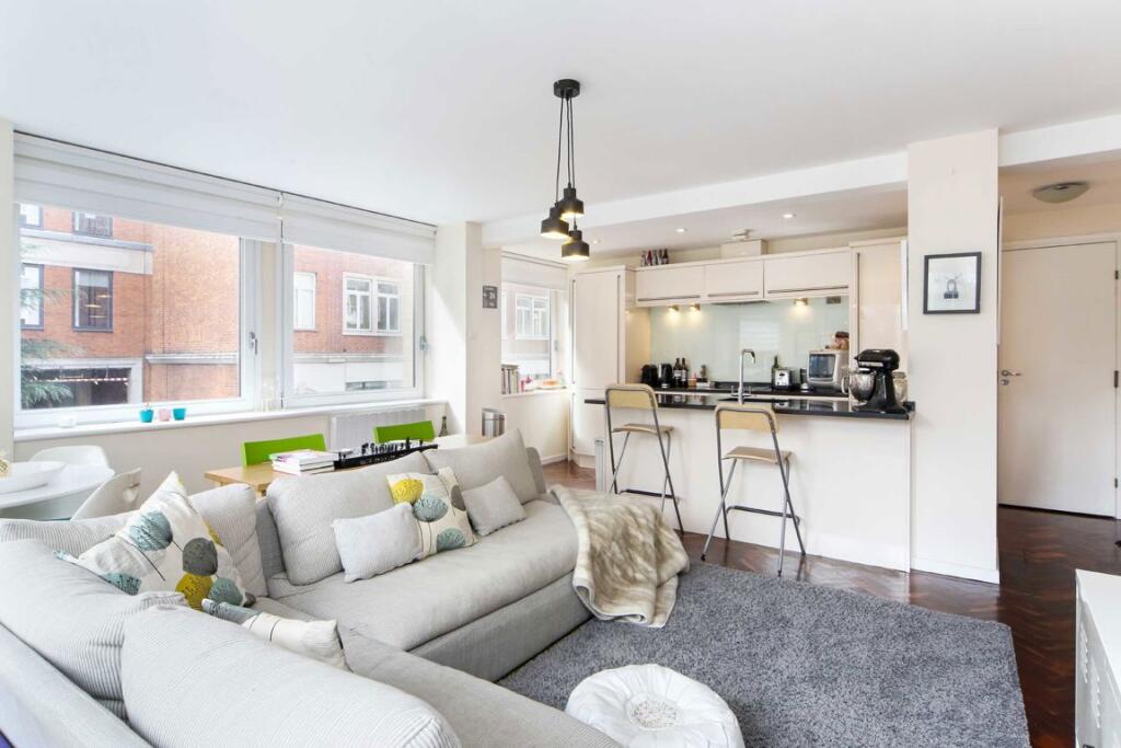 This two bedroom apartment has a double aspect open plan living room with wooden floors and kitchen with an island. It has two bathrooms (one en-suite), two bedrooms and a third room which can be used as a walk in wardrobe or study.