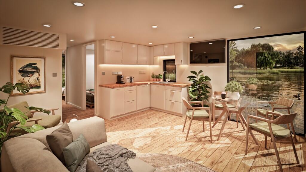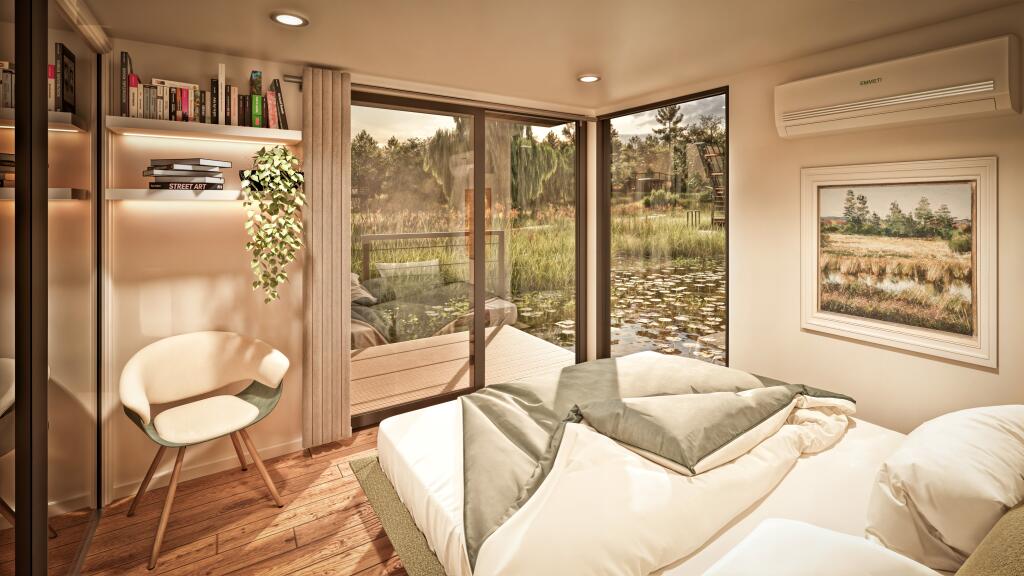 Compact yet beautifully open, the Lutra houseboat offers a flexible layout ideal for weekend escapes or creative workspaces. Its panoramic glazing and floating terrace connect seamlessly with the surrounding water and wildlife. This architect-designed houseboat brings nature to your doorstep.