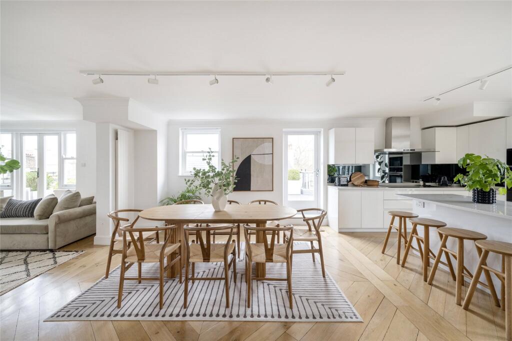Available for Short Let. Above the waterways of Little Venice, this four-bedroom penthouse for rent offers curated interiors and sweeping terrace views.