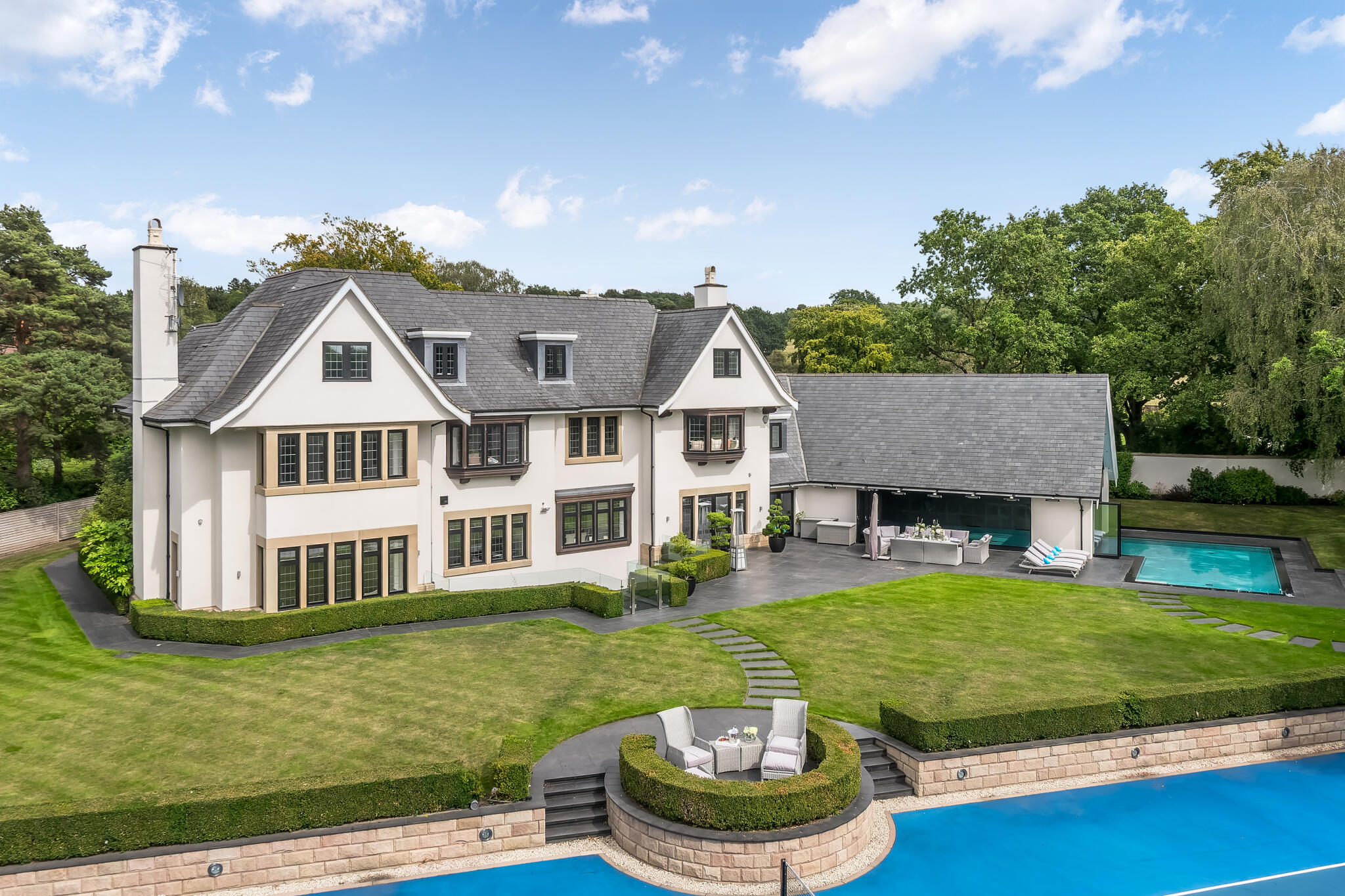This is a substantial detached property located in the desirable area of Alderley Edge. The house has 7 bedrooms and 8 bathrooms. The property is in excellent condition, with modern fixtures and fittings throughout. The property also benefits from a large garden, swimming pool, bar, cinema, and tennis court. The property is listed for £7,500,000, which is a high price, but it is not unreasonable given the size, location, and condition of the property.