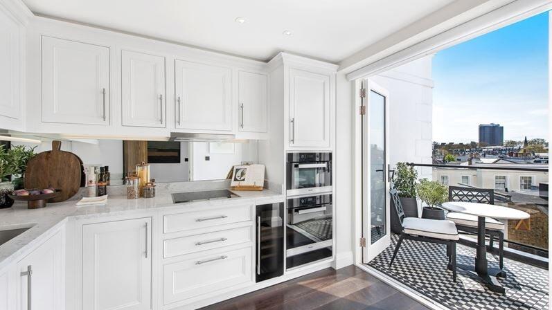 An elegant, 1136 sq. ft., 2-bedroom apartment positioned on the second floor with oblique views over neighbouring rooftops looking towards Hyde Park