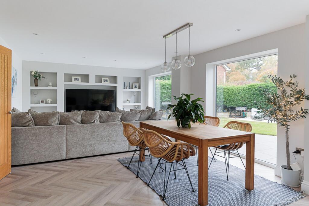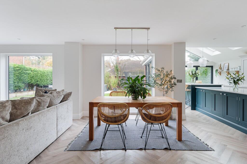 Recently renovated 5-bed property in Cheshire village. Modern luxury and practical design for family living. Open plan living area, bespoke 1909 kitchen, underfloor heating. Two patios, spacious bedrooms, wooden shutters, high-quality finishes. Elegance, comfort, function.