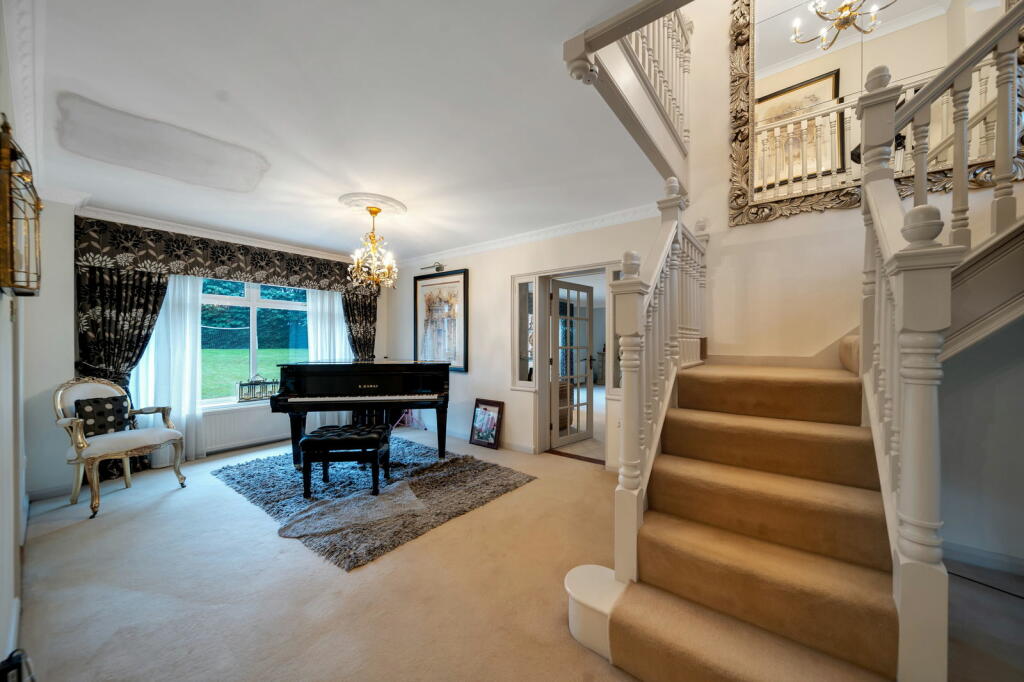 The house itself is a substantial size and includes multiple reception rooms, a well-equipped kitchen, five bedrooms, and four bathrooms. A notable feature is the heated indoor swimming pool and accompanying gym – desirable features often enhancing property value significantly. The extensive grounds surrounding the property are a significant asset, providing a substantial garden with ample space for outdoor activities. The inclusion of a basketball hoop and the sheer size of the outdoor space is a key benefit for families with children.