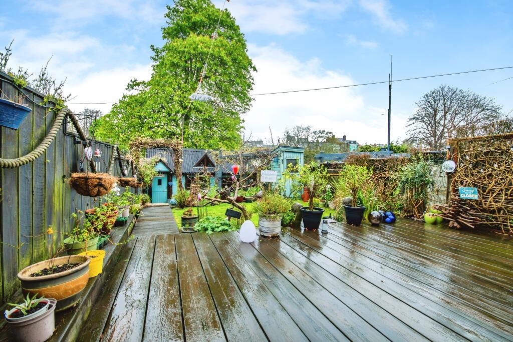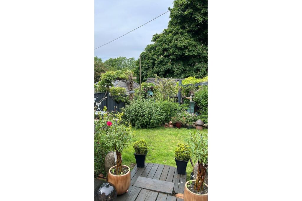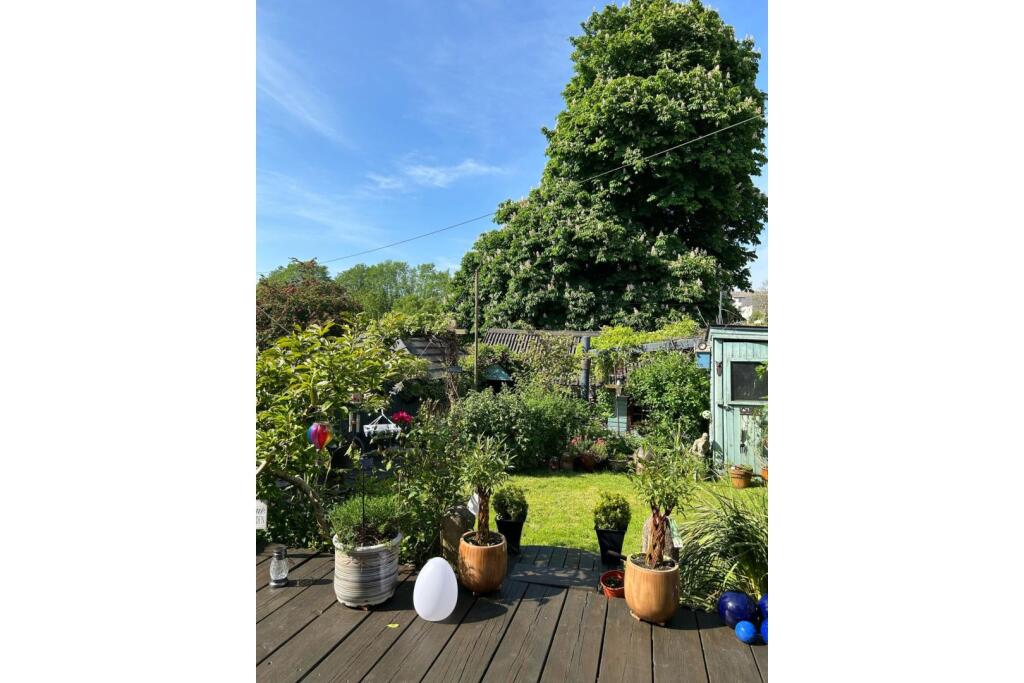 The property includes a garden, which is a significant advantage. The images show a well-maintained and sizeable garden space with various plants, a shed, and decking. The garden contributes positively to the overall appeal of the property.