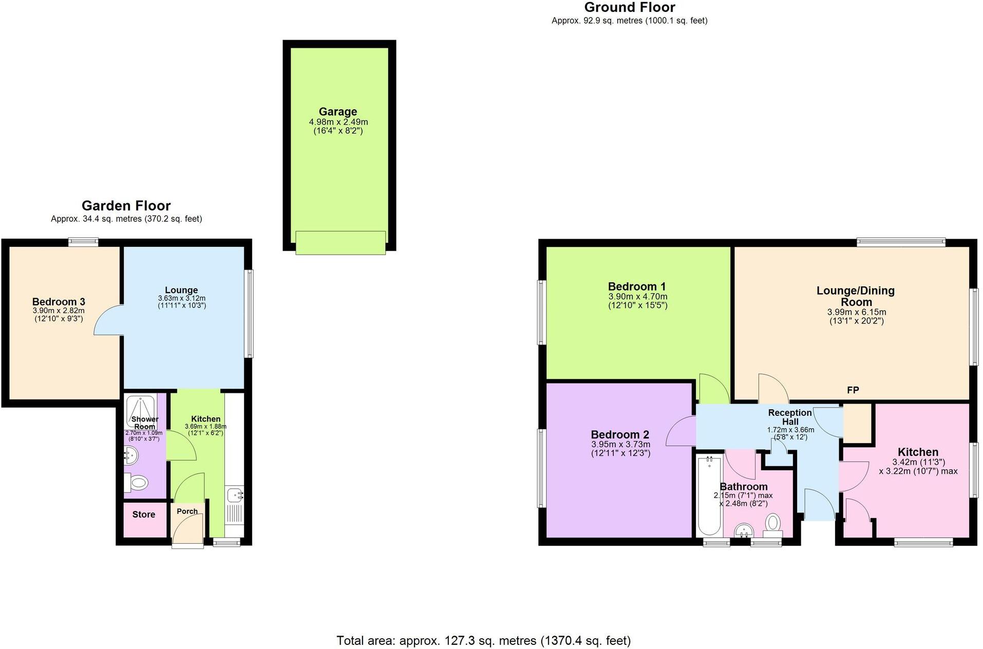 The property is a detached house with three bedrooms and two bathrooms. It offers 1,343.11 sqft of living space and sits on a plot of land. The property also benefits from a garden and garage.