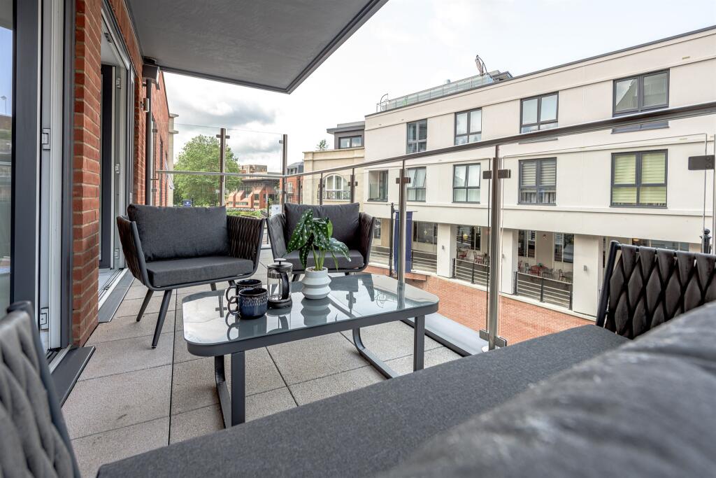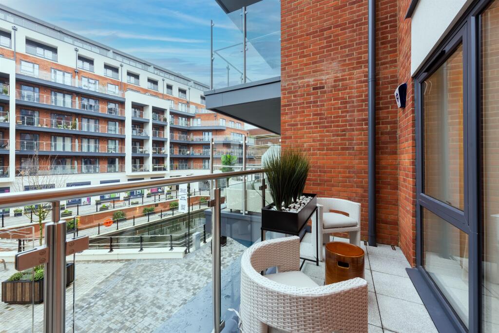 This property is a modern apartment located in the Waterside Quarter of Maidenhead, Berkshire. The apartment is situated on the High Street, placing it in a central location within the town. The images suggest the property is in excellent condition, with modern fixtures and fittings throughout. The kitchen and bathroom appear to be newly fitted, and the living spaces are well-presented. The property benefits from a balcony.
