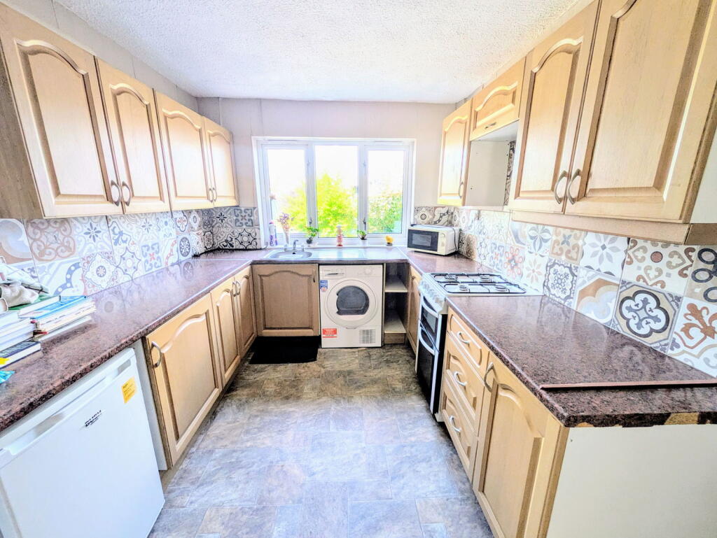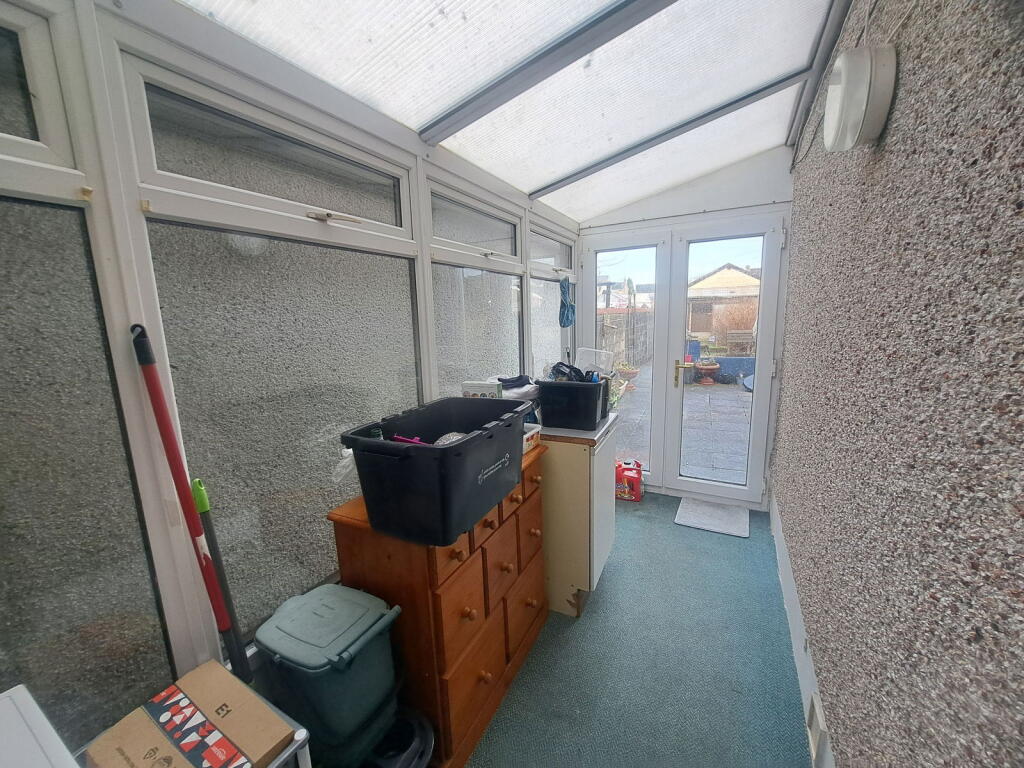 The property features three bedrooms, one bathroom, and a kitchen. Photos reveal a dated interior, suggesting a need for modernization. The kitchen and bathroom cabinetry appear relatively older. Carpeting throughout requires updates. A conservatory adds extra living space, albeit needing some tidying. The garden is relatively small with areas of gravel and some planting. The need for some landscaping is apparent.
