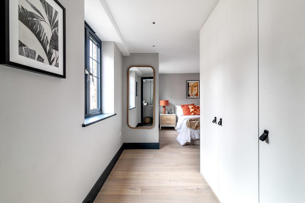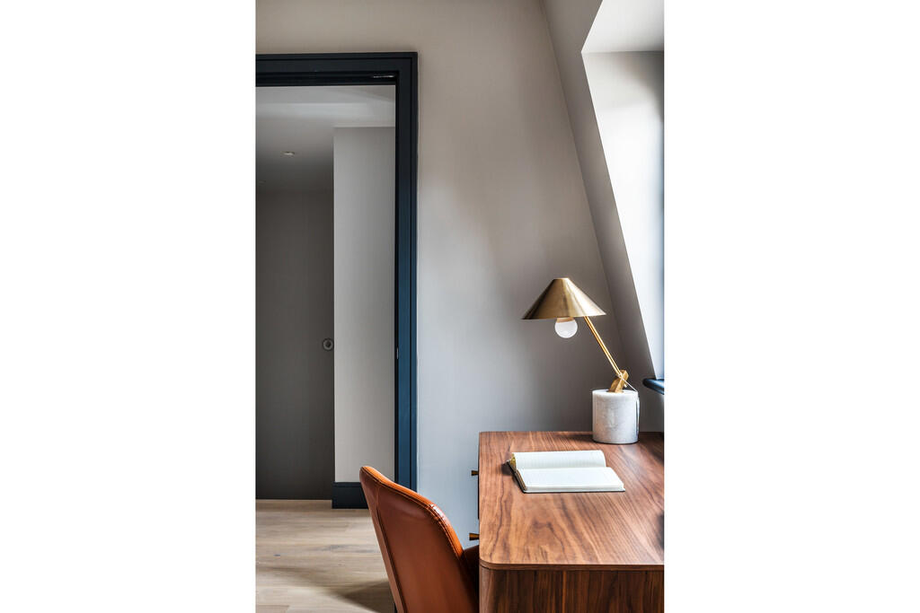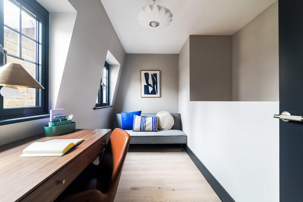 A two bedroom duplex apartment with study and private roof terrace on the top two floors of a stylish development featuring warm neutral tones and contemporary finishes. The apartment offers rooftop views, lift access and a convenient West End location. Available unfurnished, from early September.