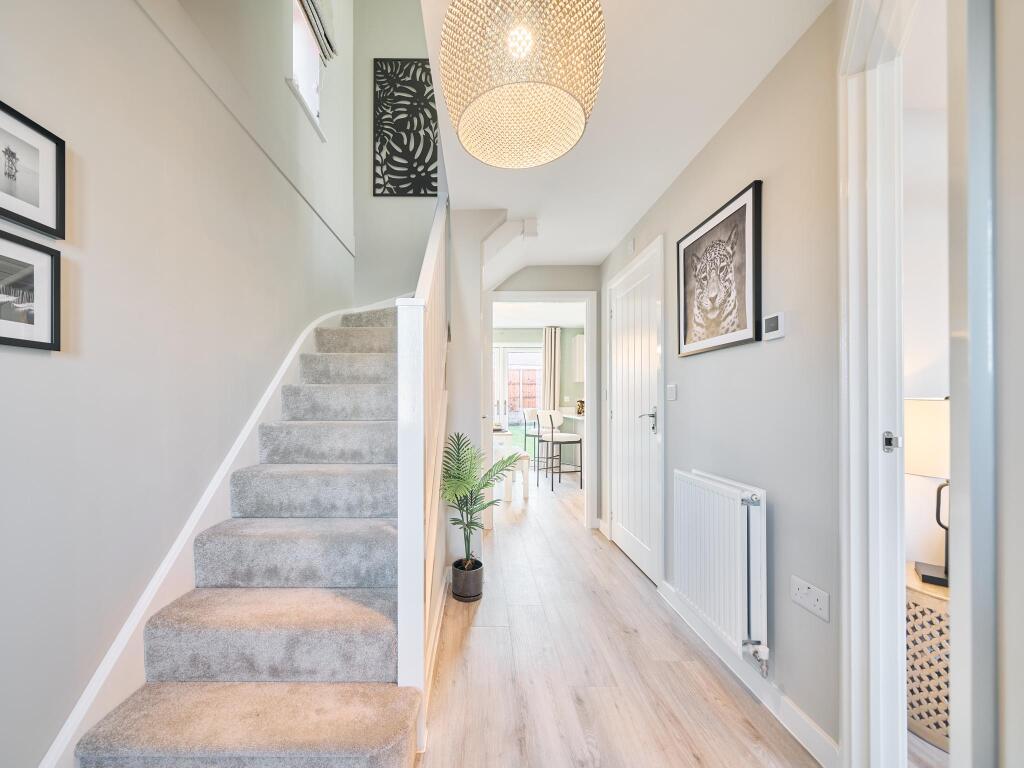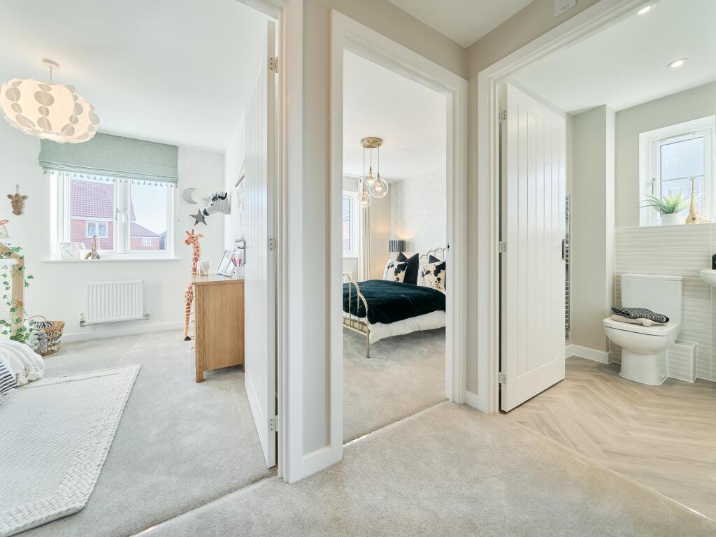 The three-bedroom Stretton has an open plan kitchen/dining room with French doors to the garden and a spacious front-aspect living room with a bay window. Upstairs there are three bedrooms - bedroom one has an en suite - and a family bathroom.
