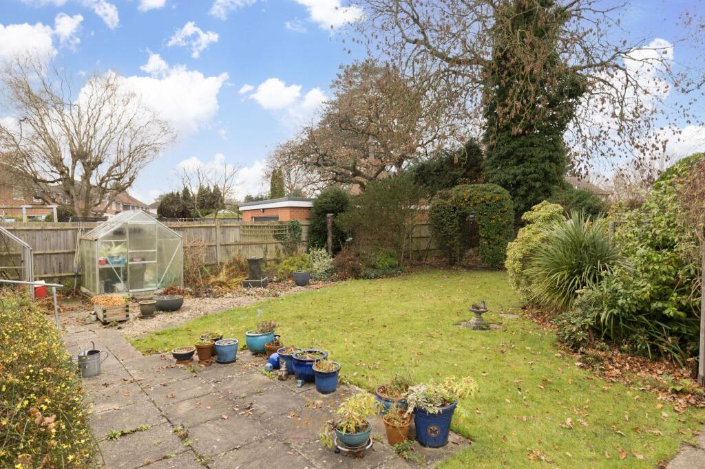 This is a detached property in Horley featuring five bedrooms and one bathroom. The house has a traditional style with some modern updates, particularly in the bathroom. The kitchen and some bedrooms may benefit from renovation. It includes a garage and a good-sized garden with a patio. The property is located within a reasonable distance of schools, transportation, and Gatwick Airport.