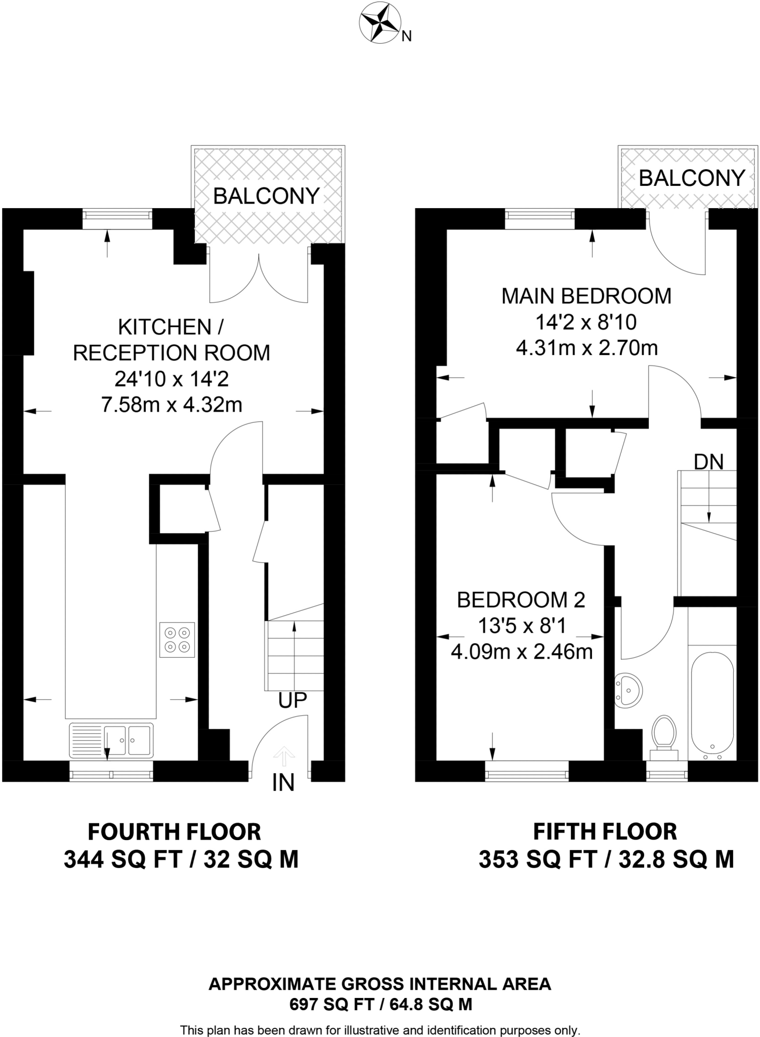 Modern two bed apartment set over two floors, featuring two spacious double bedrooms, a bright reception with open-plan kitchen and two balconies. Stylish split-level living with contemporary finishes.