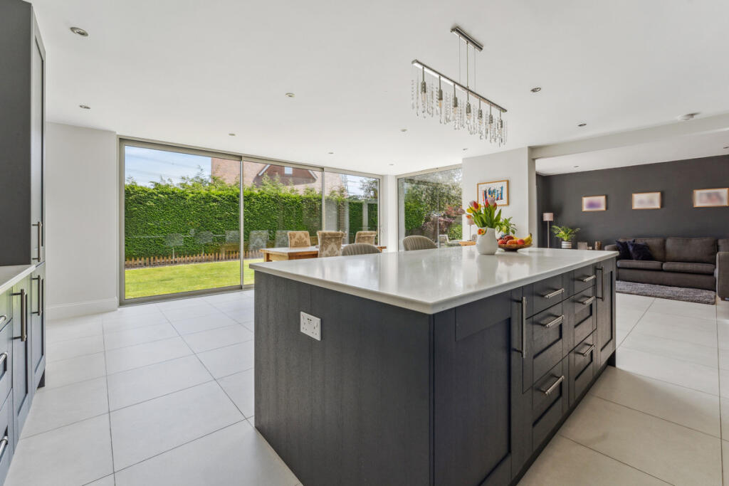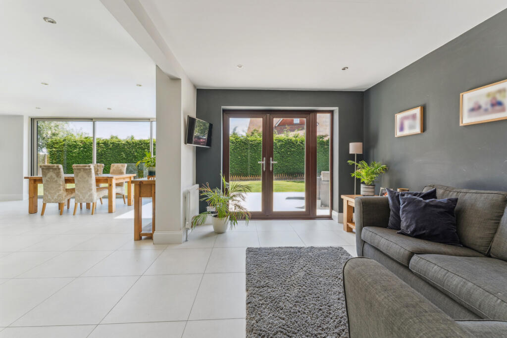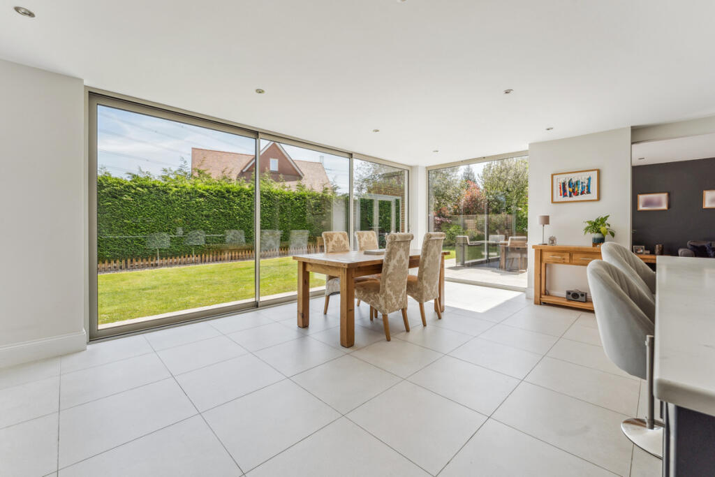 The images show a property that appears to be in excellent condition. It has been recently renovated or extended, featuring a modern kitchen and extension with bi-fold doors opening to the garden. The interior is well-presented and finished to a high standard. There is evidence of modern fixtures and fittings throughout.
