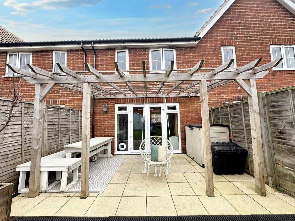 Impeccably presented 3-bed terraced house in sought-after location. Open-plan lounge/dining room leading to west-facing garden. Modern kitchen, modern bathroom, well-presented garden and parking.