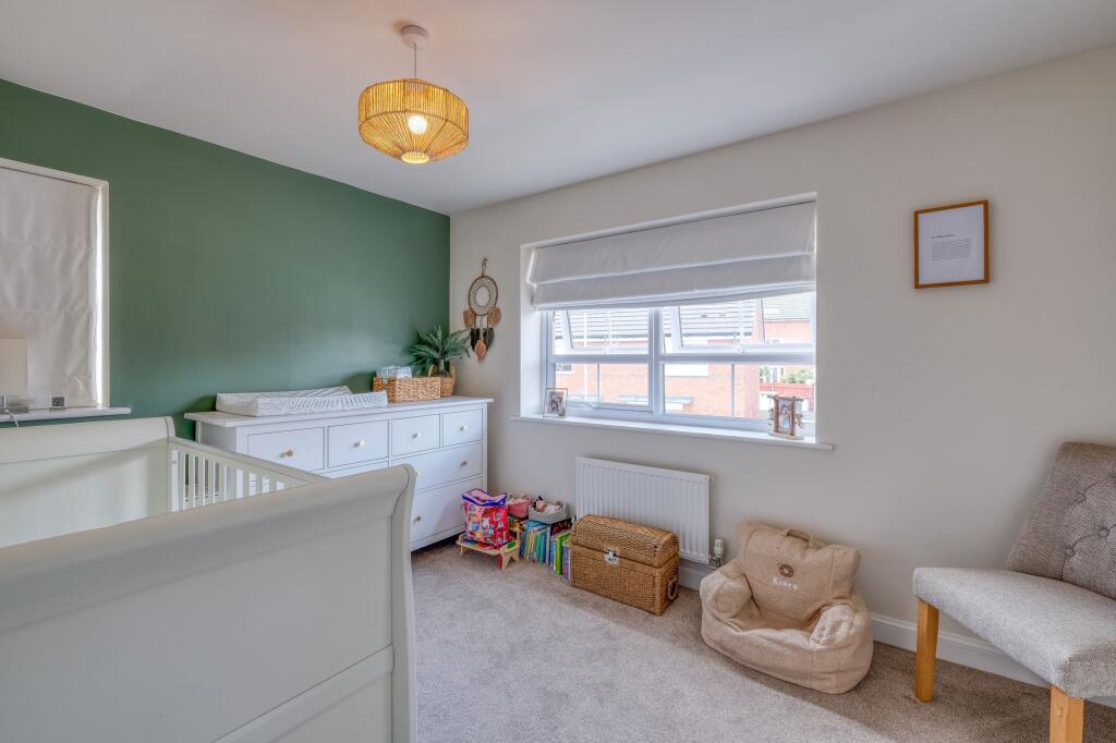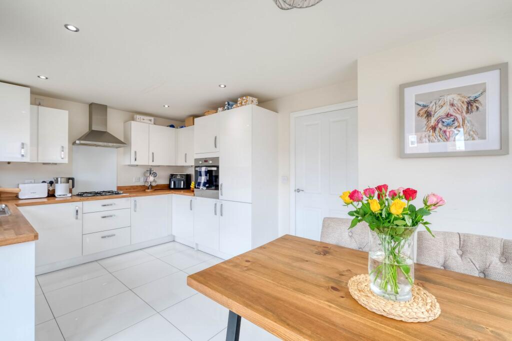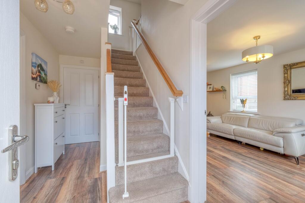 Impressive 3-bed detached home in Stoke Prior, Bromsgrove with modern kitchen/diner, en-suite master bedroom, landscaped garden, garage, and off-road parking. Maintenance fee £125/year to Trust Green.