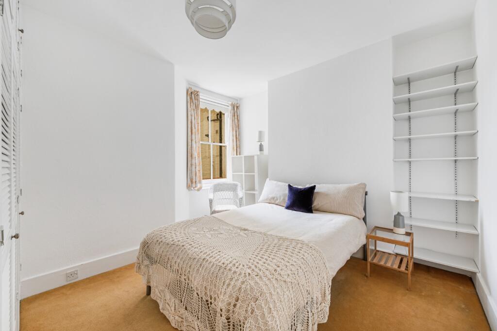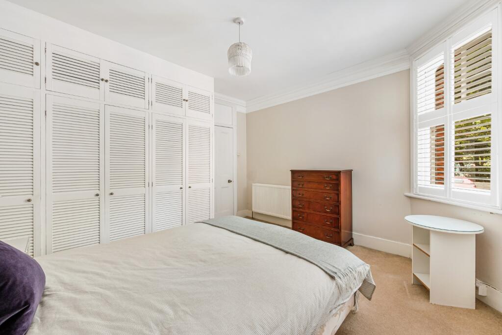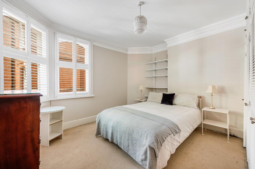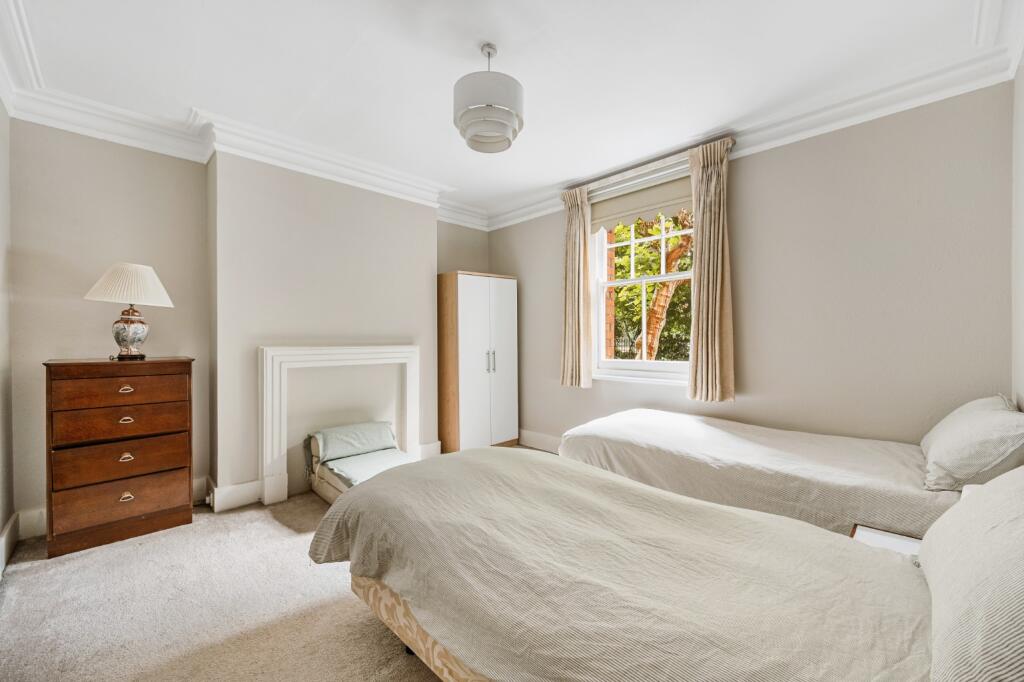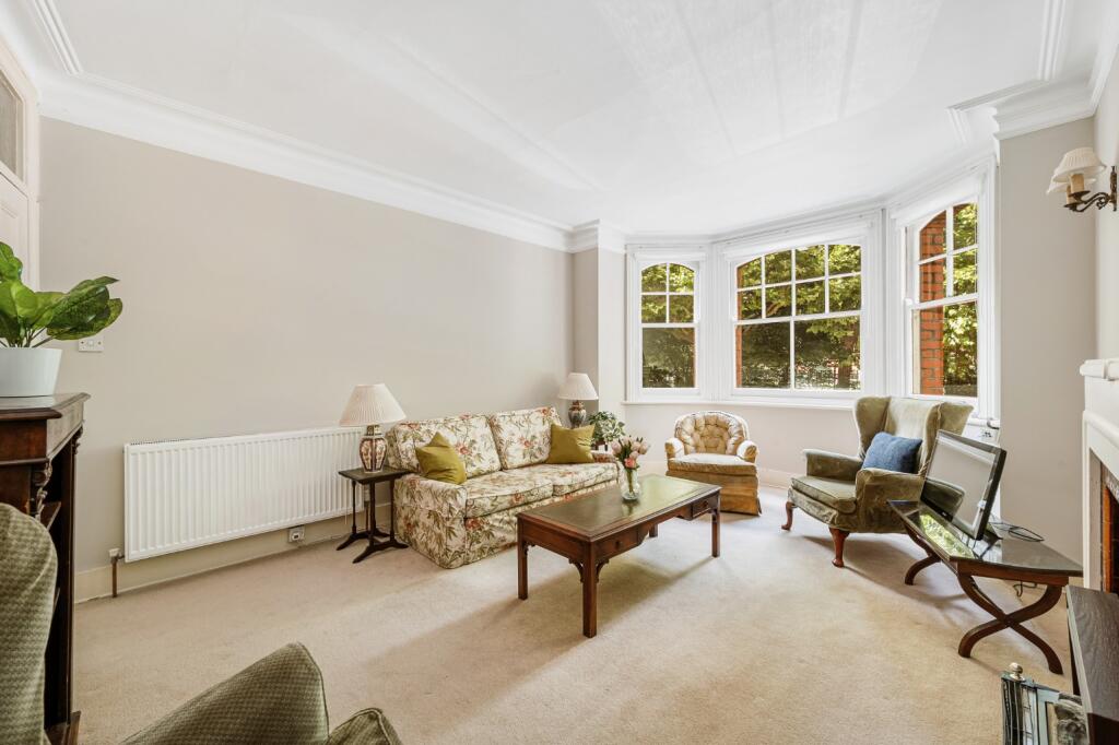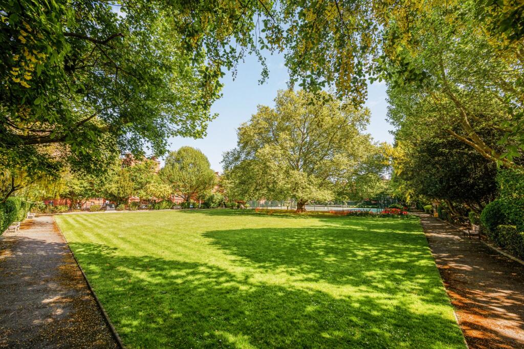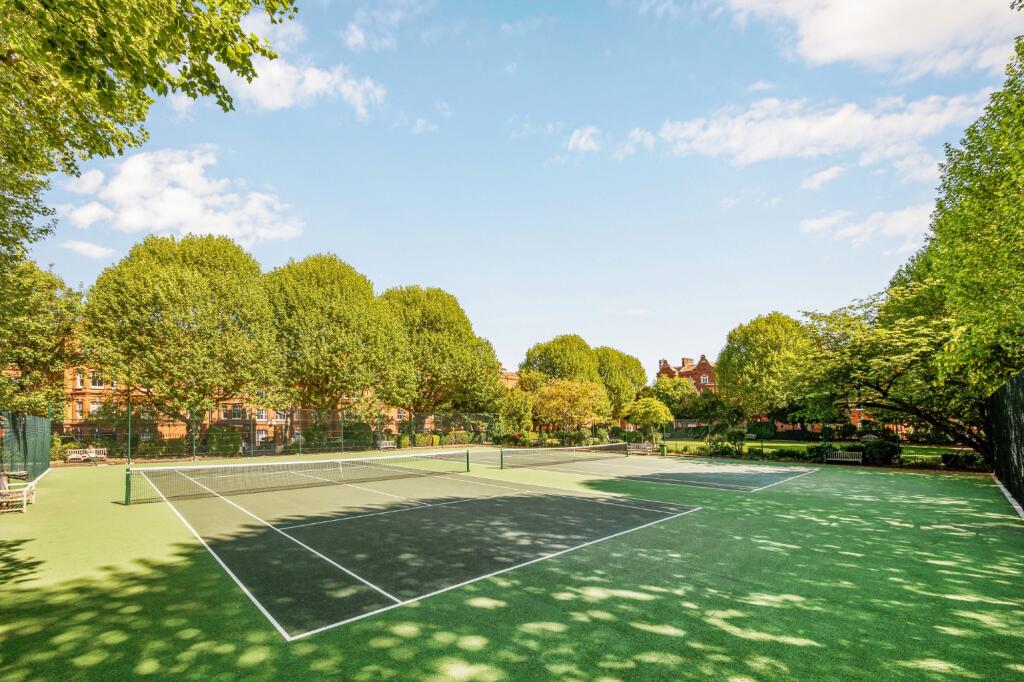 Raised ground floor flat with direct views over gardens and tennis courts. Three equal-sized bedrooms, high ceilings, and separate kitchen. Access to Queen’s Club Gardens’ private courts and green space. Share of freehold, close to Barons Court and Queen’s Club.